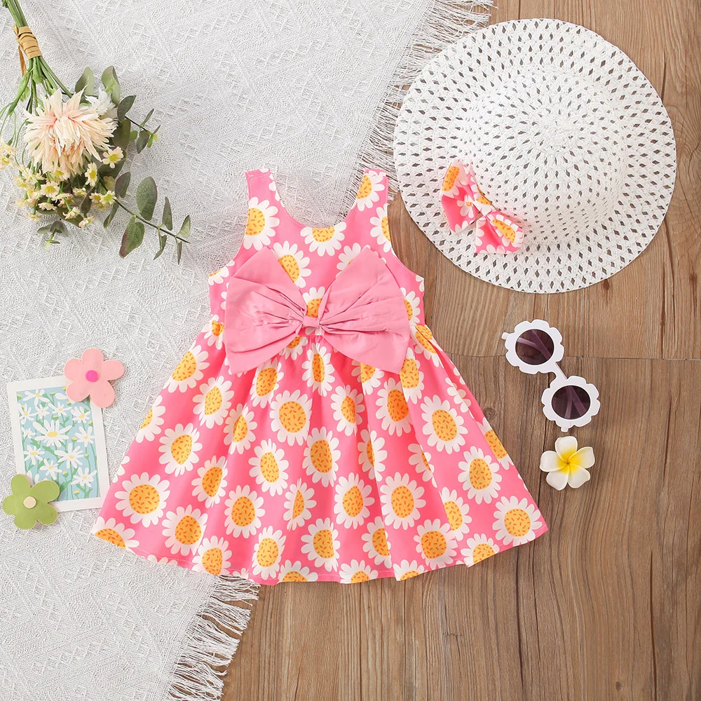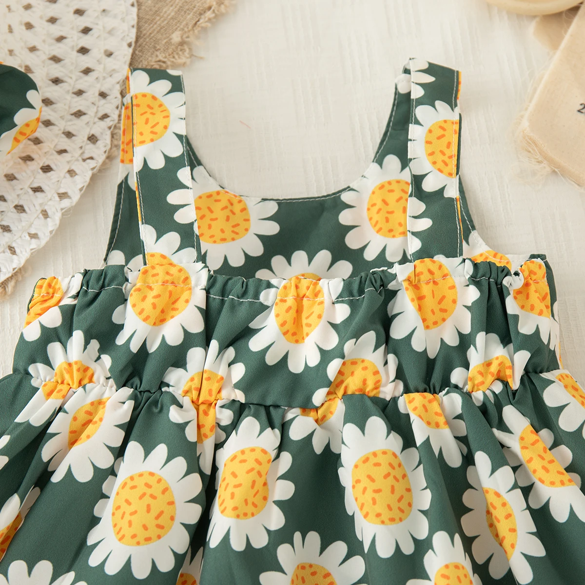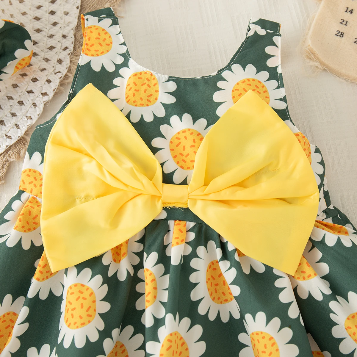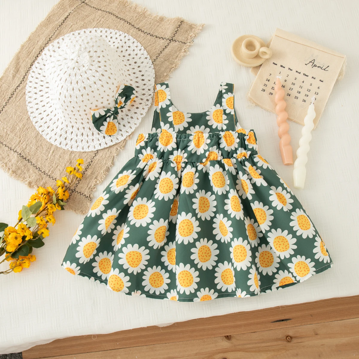 Baby Girl Dress Summer Bow And Sunflower Pattern Halter Beach Girl Kid’s Dress Cute Casual Baby Dresses With Hat