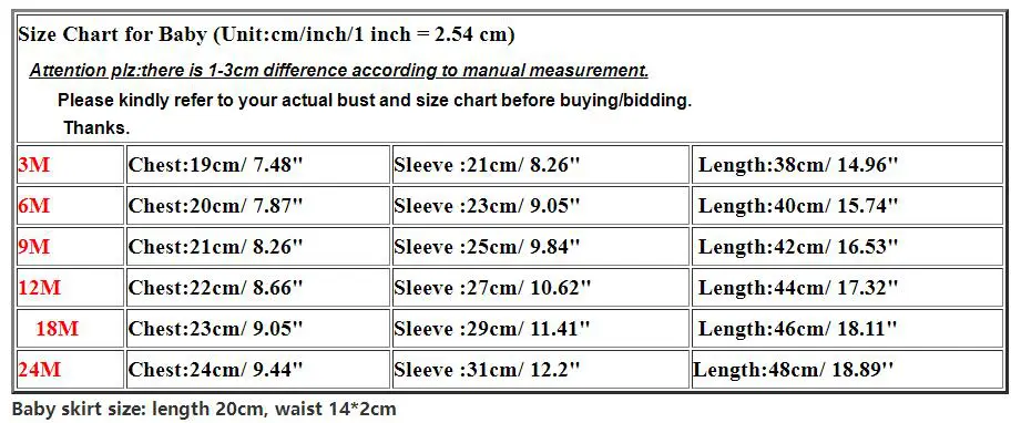 2. Size: ” M ” means months, pls allow tolerance at 2-3cm,1inch=2.54cm