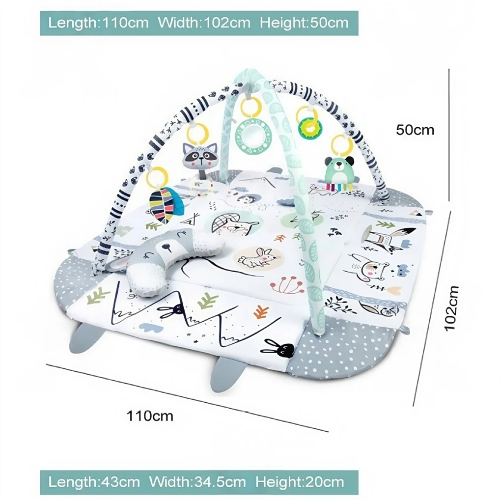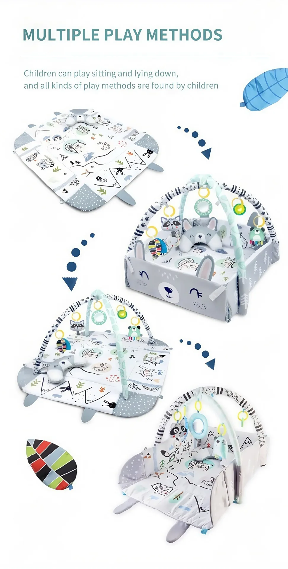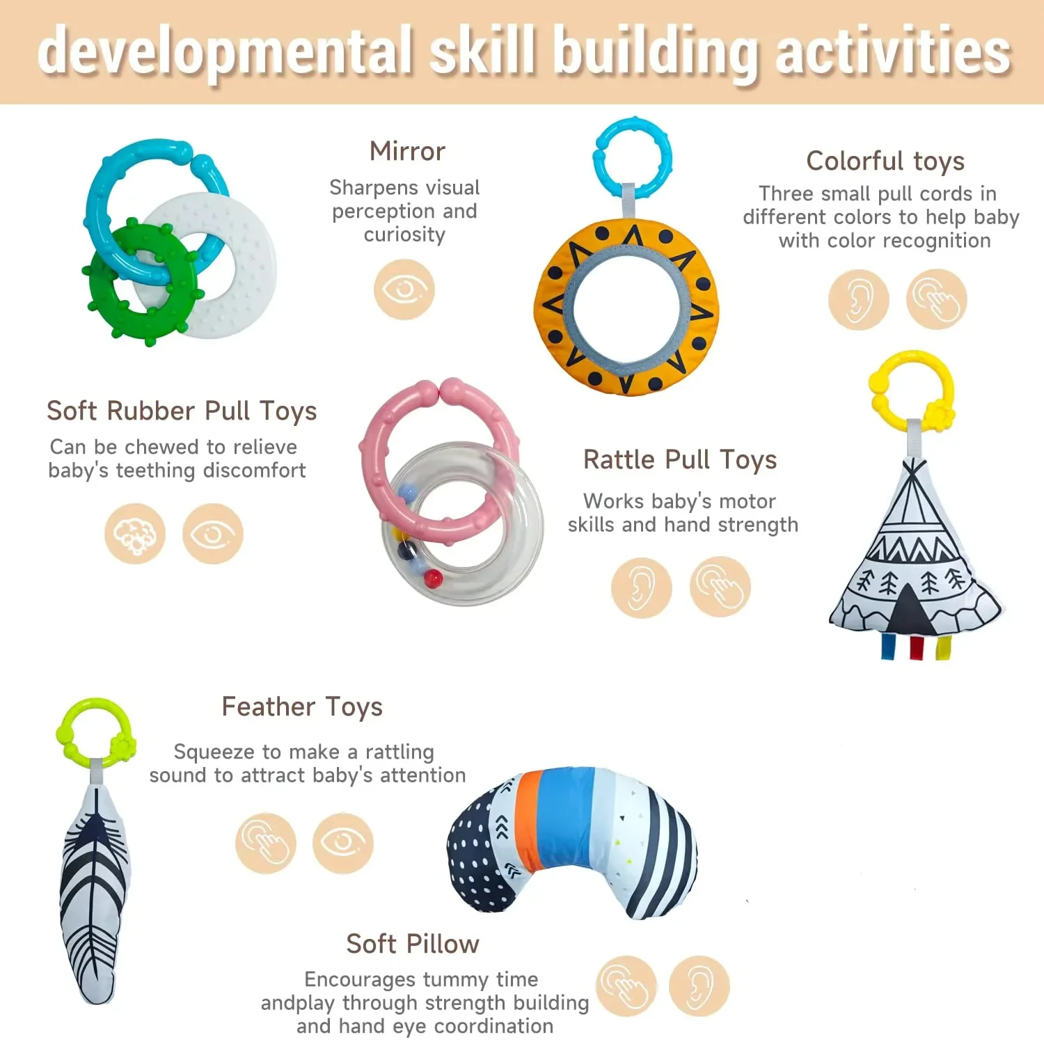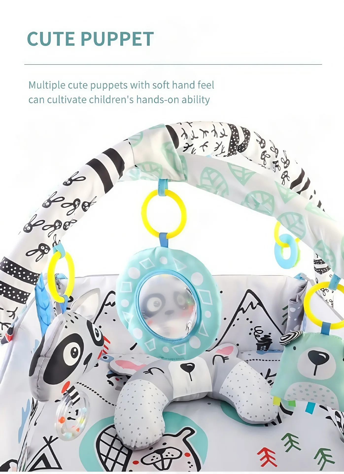 [8-in-1 Baby Activity Play Mat]: Our animal-themed play mat includes 3 fabric toys with sound effects, a self-discovery mirror, safe teethers, a tummy time pillow, encouraging exploration, learning, and growth. It offers different play modes like tummy time, seated play, and ball games, providing crucial support during milestones like rolling over, crawling, and sitting up, aiding in baby’s development.
