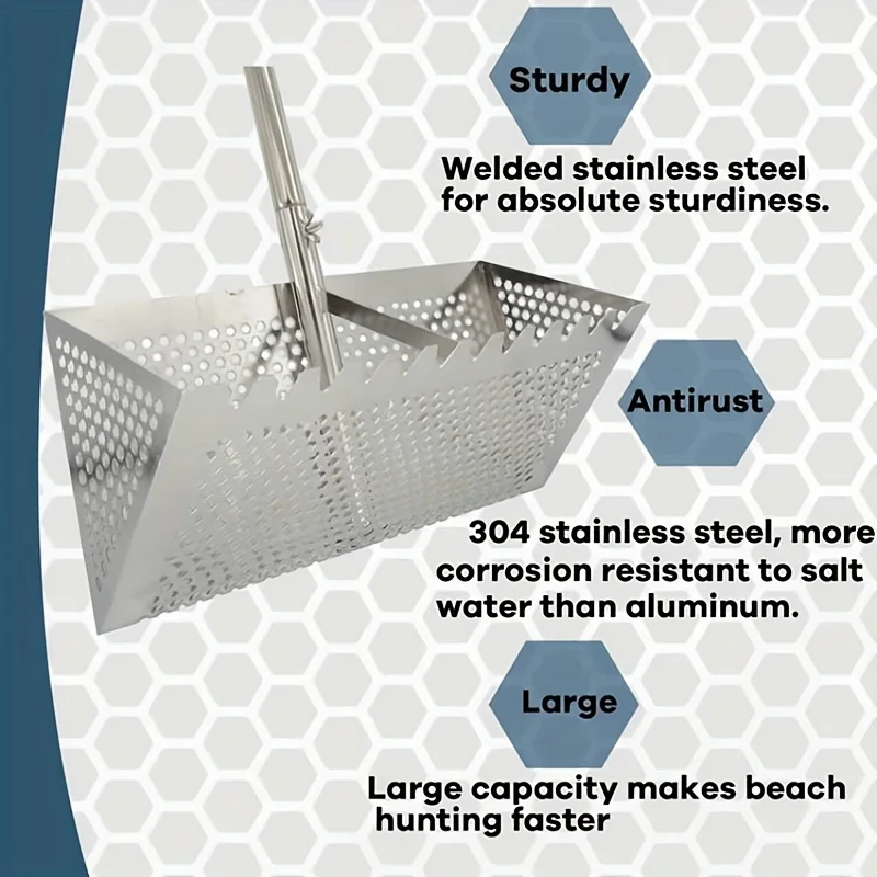 Efficient and Practical: The sand flea rake boasts a solid and seamless construction, without welding spots. Its wide basket and efficient design, including a perfectly sized 8mm leak hole and hexagonal leak hole for quick sand removal, make it highly effective for sifting sand fleas, shells, shark teeth, and other debris.
