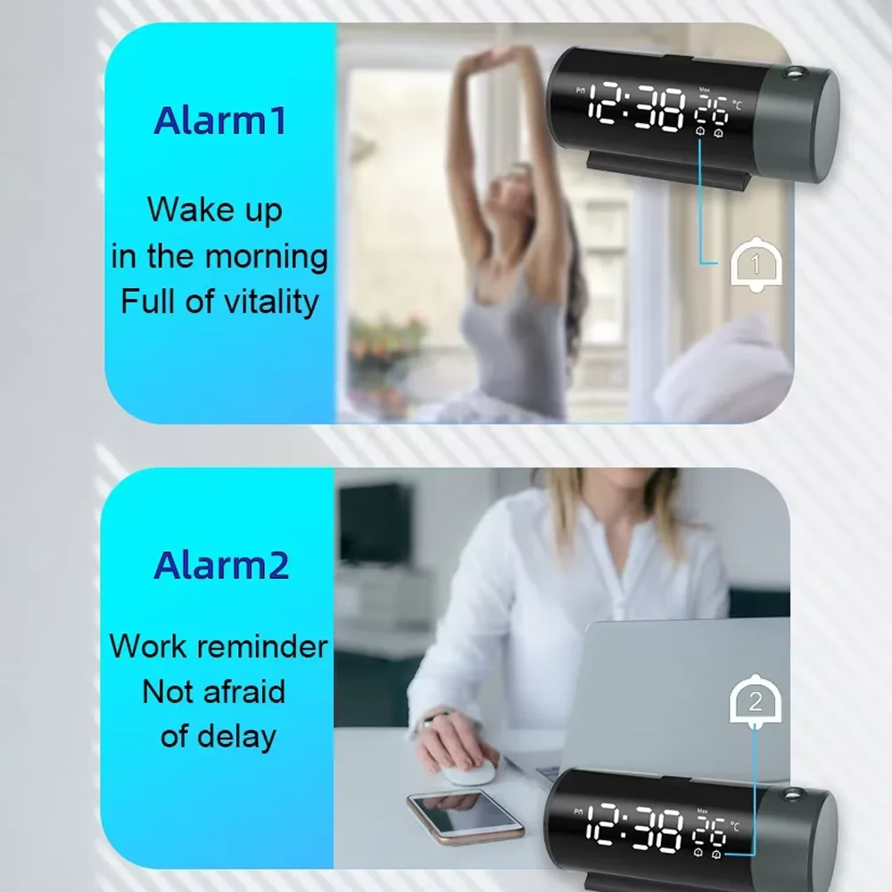 【Dual Alarms with Snooze Function】 This projection alarm clock has two separate alarms design which could wake you and your companion up at different alarm time setting, or double waking-up service for you only. Press the SNOOZE button at the top to get extra setting minutes sleep till next loop of this alarm, alarm voive is loud enought for heavy sleeper.
