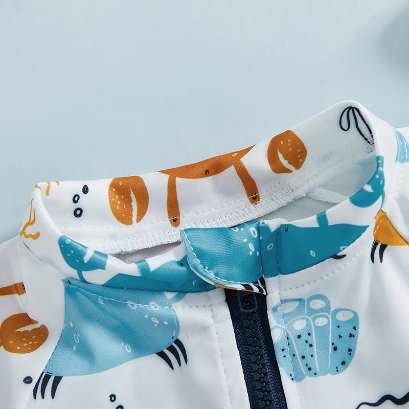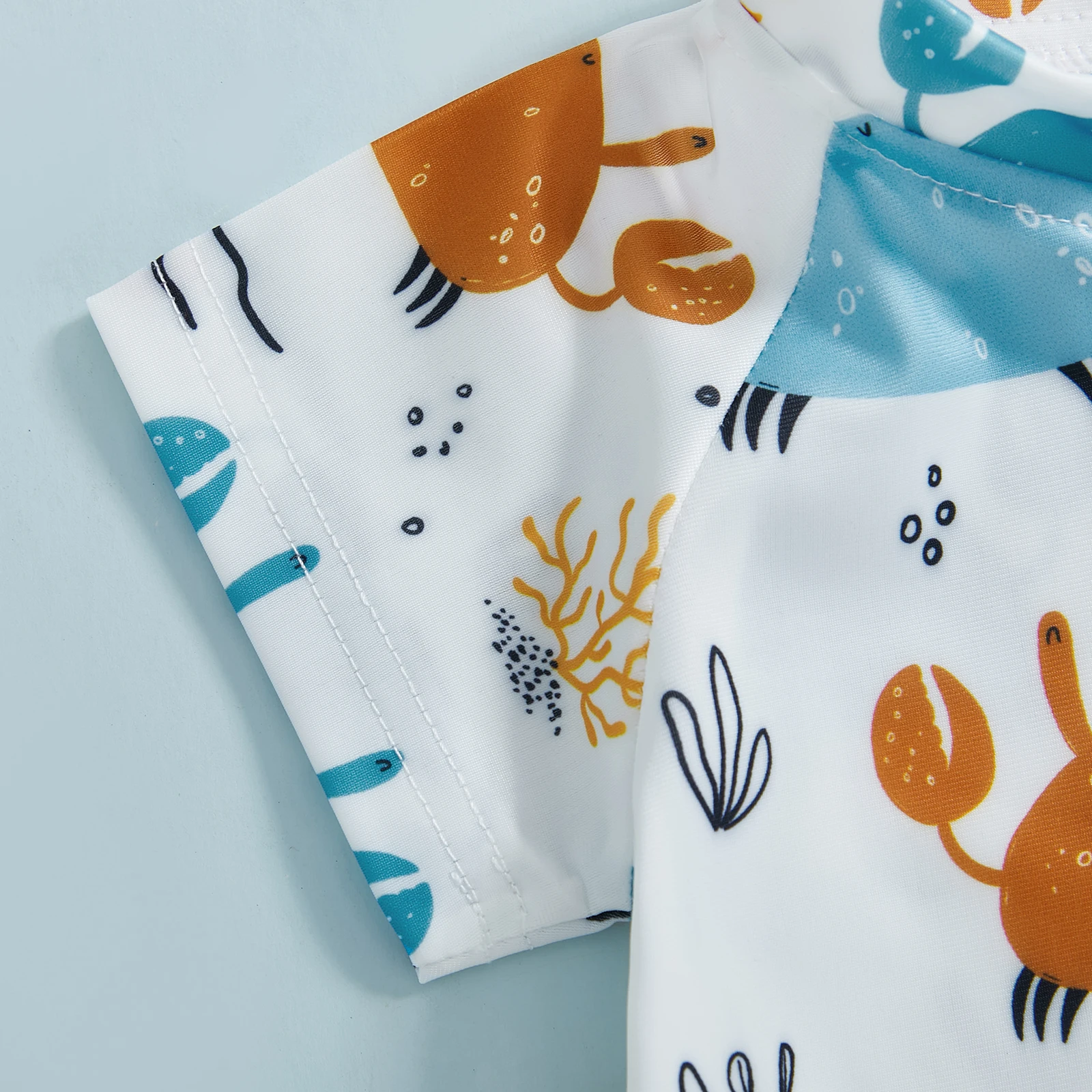BeQeuewll Fashion Boy Summer Swimsuit Cute Cartoon Crab Print Half Zipper Infant Swimwear Rash Guard Kid Bathing Suit Sunhat Set