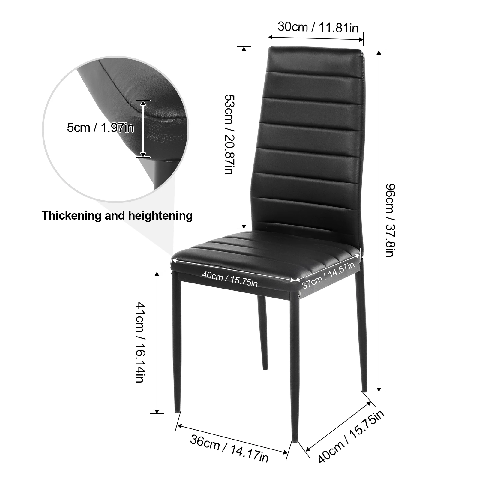 Chairs:15.16 * 15.75 * 38.58 inch / 38.5 * 40 * 98 cm, the height of the seat from the ground is 17.13 inch / 43.5 cm. The diameter of the tabletop is 35 inch /90 cm,height: 75 cm / 29.52 inch.