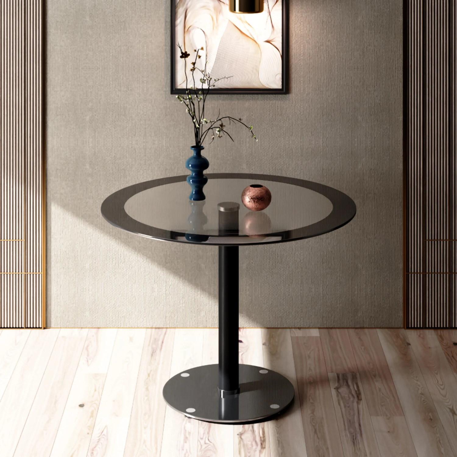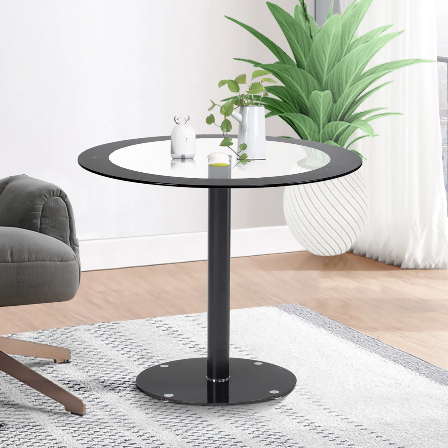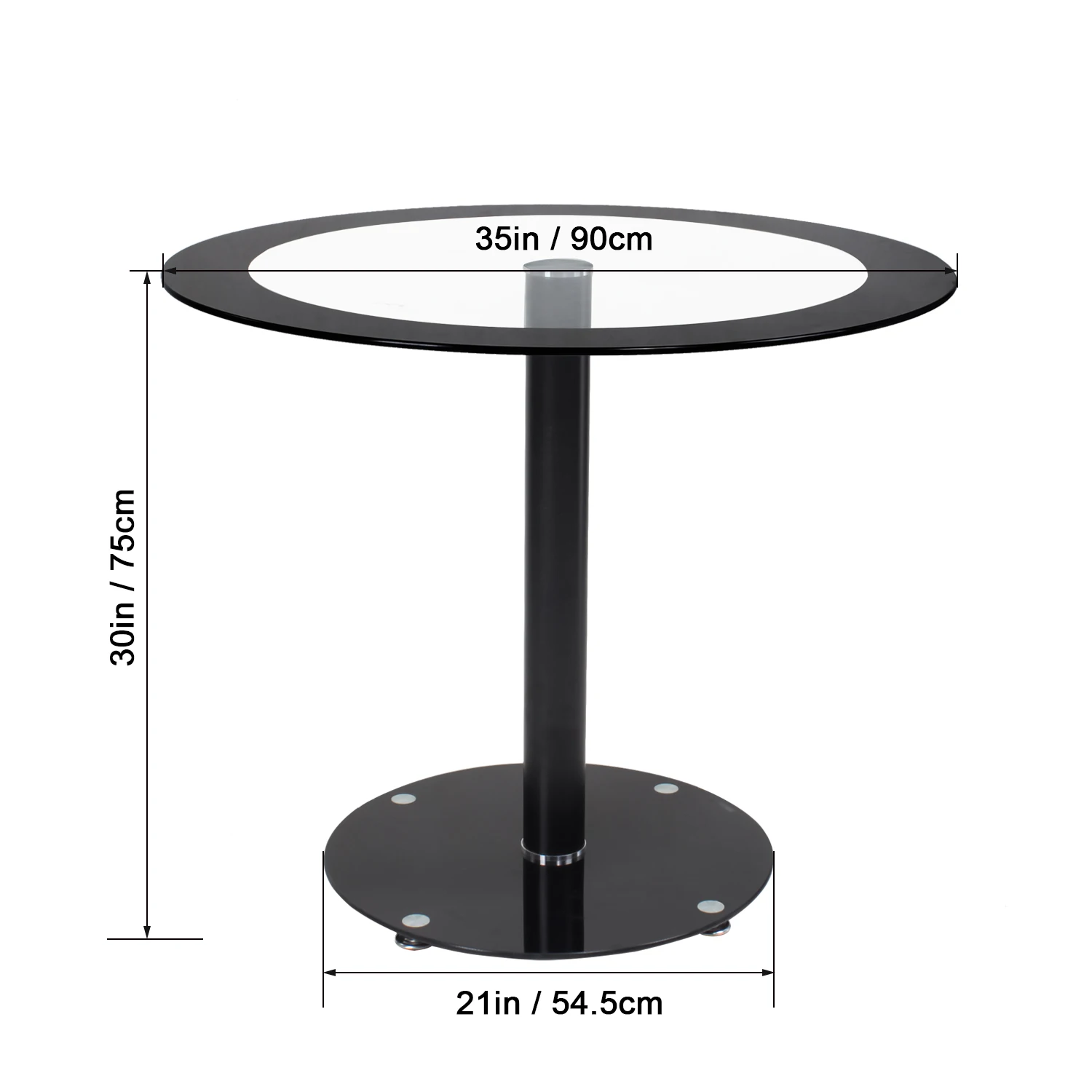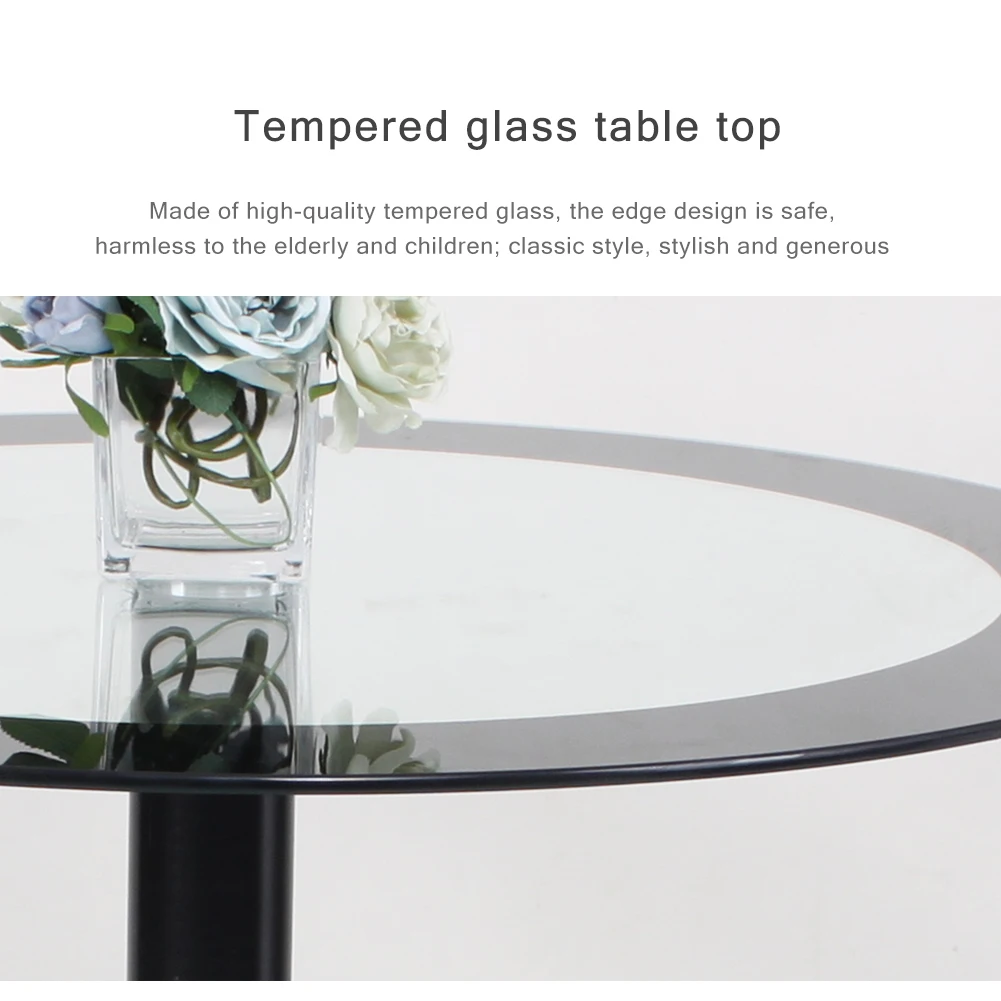 8 mm thick Round tempered glass table top with heavy steel metal support and base. Stable, Sturdy ,Durable and Easy to clean. No sharp corner, that will not cause dangers.