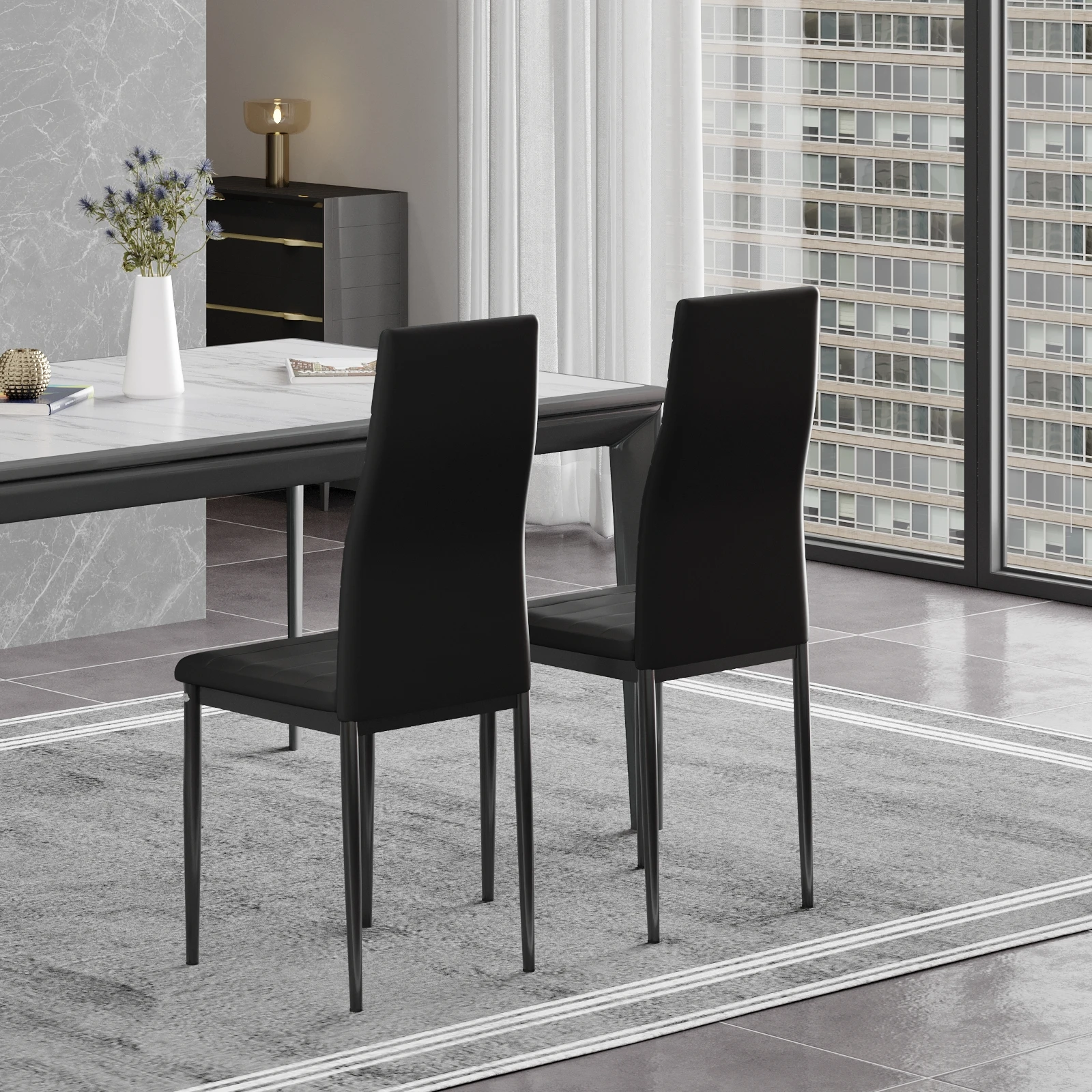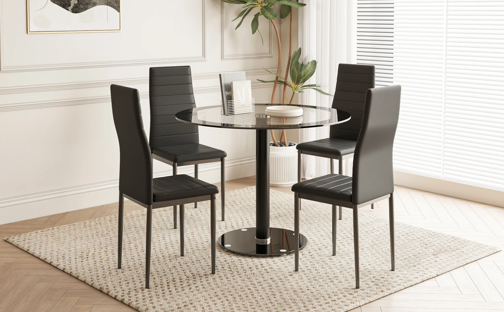 Black Dining Table and Chairs Set of 4, Round Tempered Glass Table with High Back PU Leather Chairs
