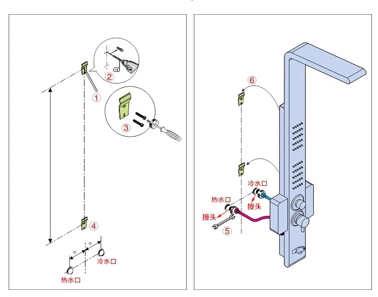 3. Wrap the raw material tape at the joint thread , connect the hot and cold water pipes (⑤)( Red hose is connected to hot water ,blue water is connected to cold water )