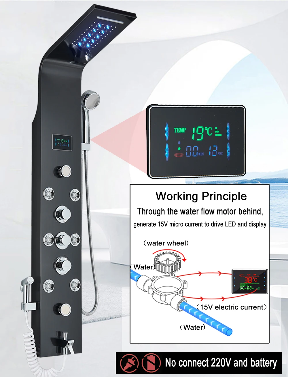 -This product not need any battery or other 110V/220V power input,The LED and Temperature display by water flow,There is a motor inside the product,When there is enough water flow through the motor, it will generate a safe power supply for LED and Digital display.