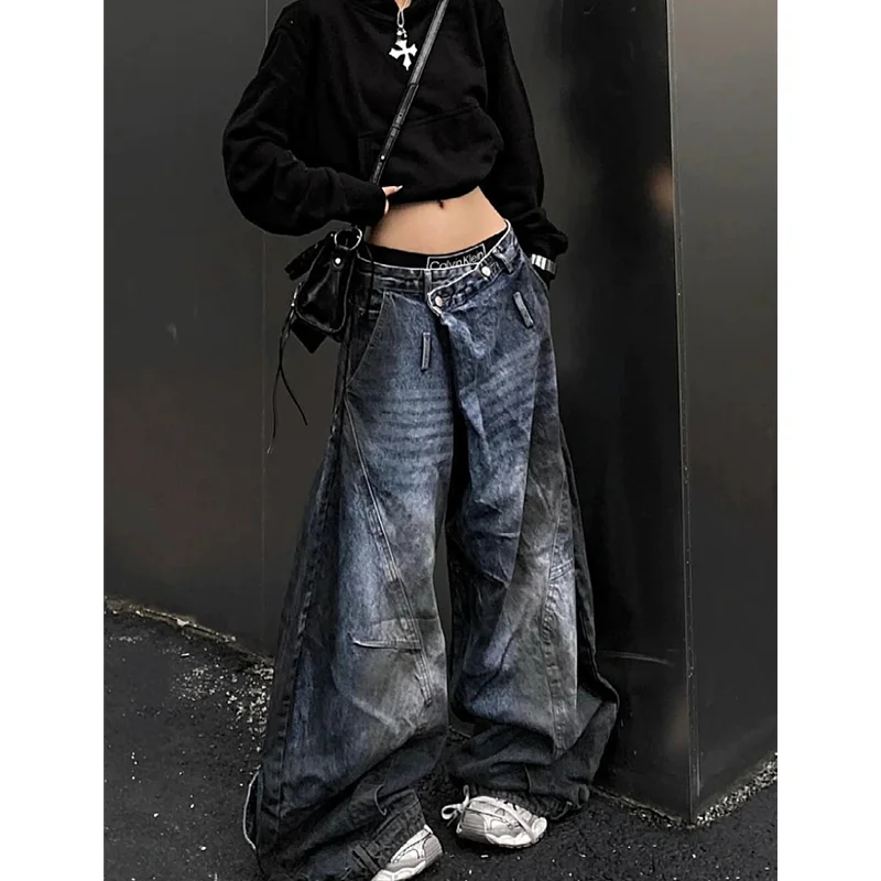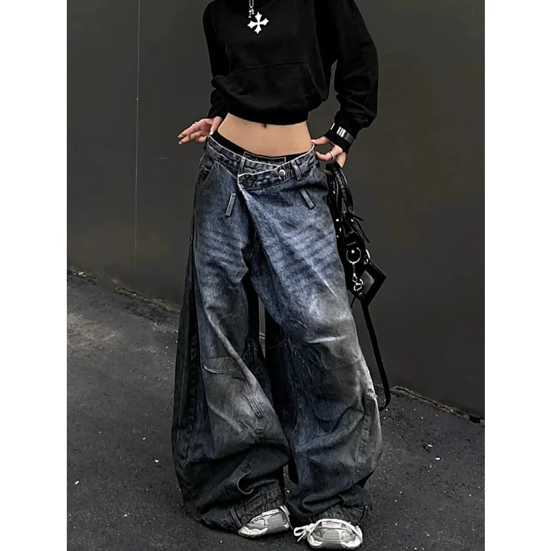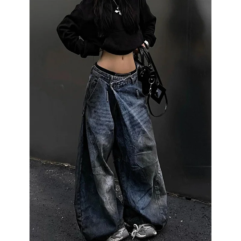 Blue Womens Jeans High Waist Vintage Design Hip Hop Straight Baggy Denim Pants Street Y2K American Style Wide Leg Denim Trouser