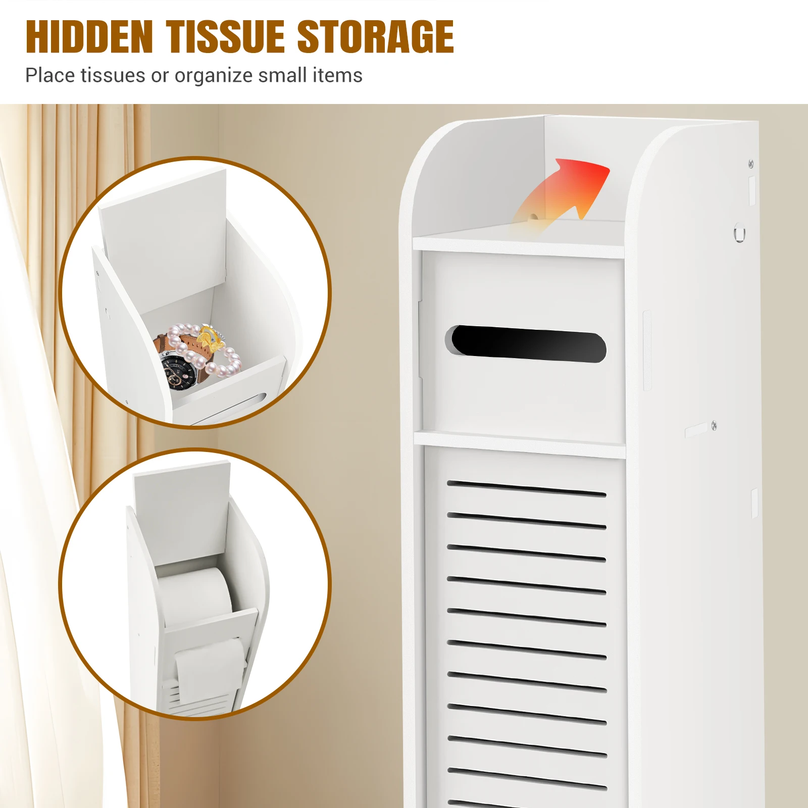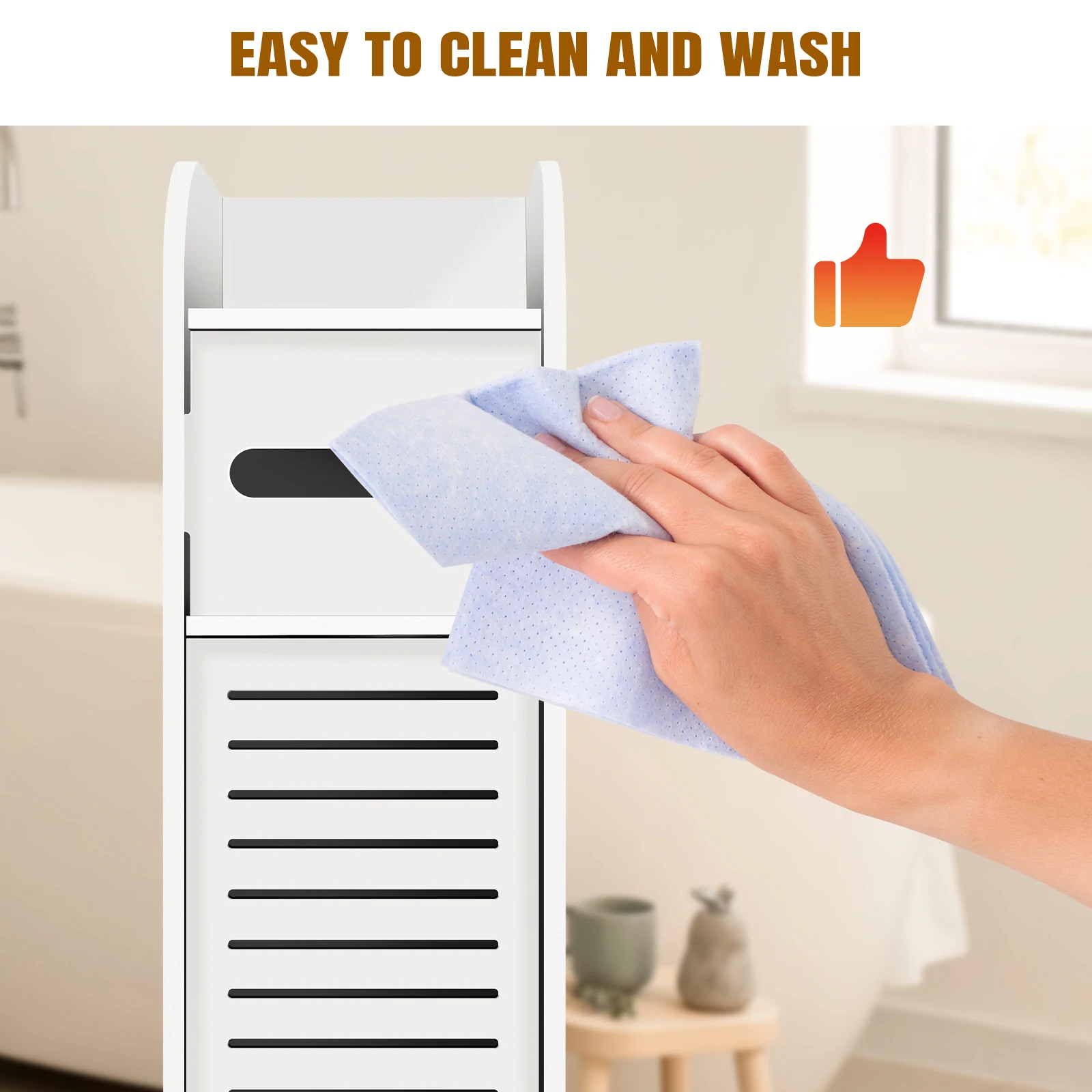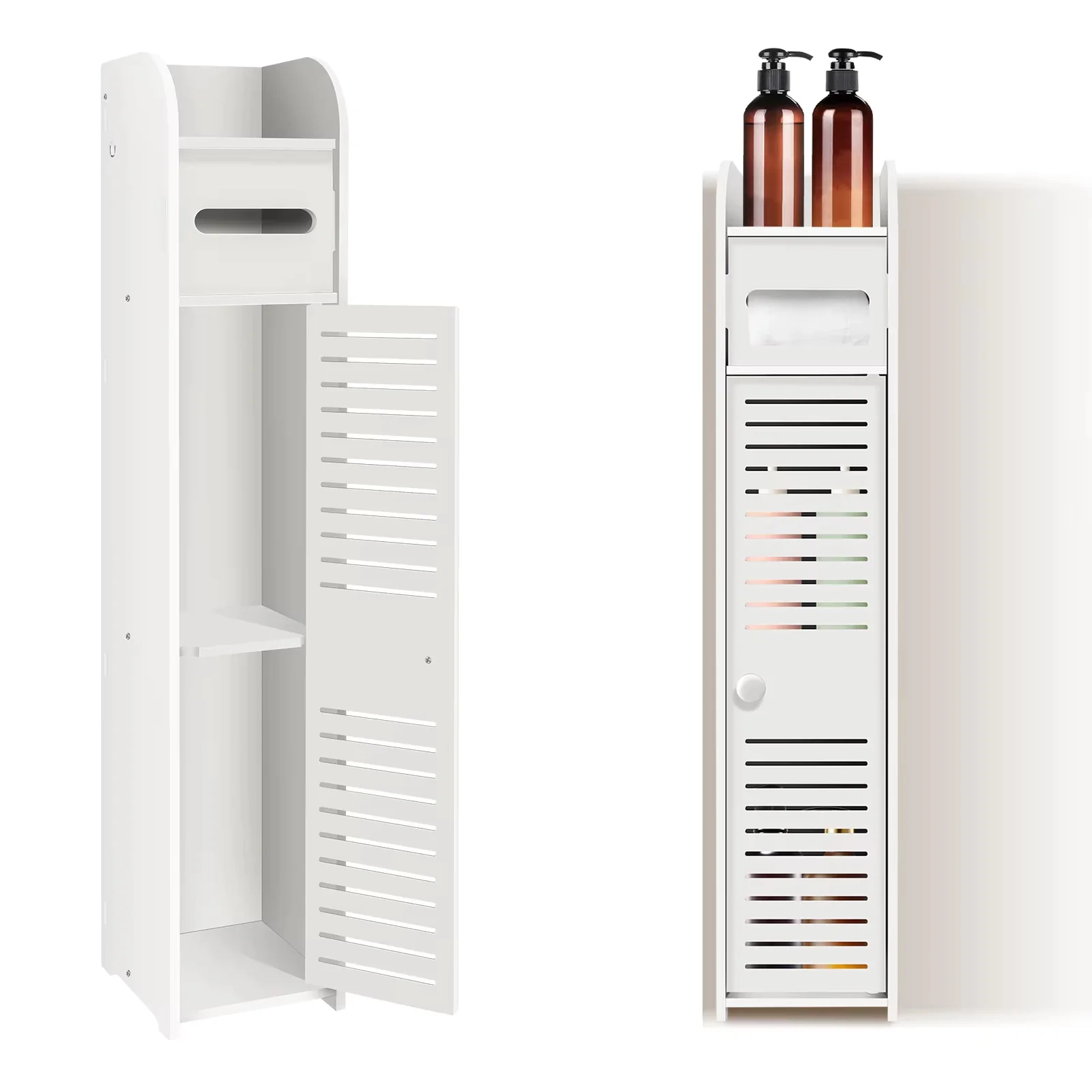 2.Perfect 4 Tier Design – The size of Bathroom Storage Cabinet after assembly is: W6.3”x D6.3”xH32″. Four-layer design, the top panel is suitable for placing mobile phones or cups (can be opened to replace paper towels), the paper towel cabinet size is 4.5”(L)x4.5”(W) (cannot accommodate roll paper larger than this size). The bottom layer has a large space for storing various toiletries.