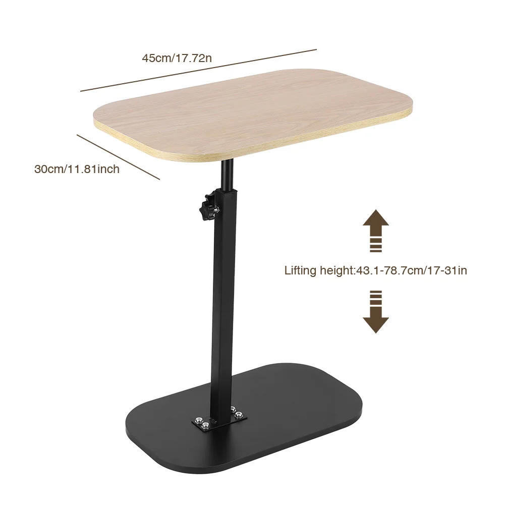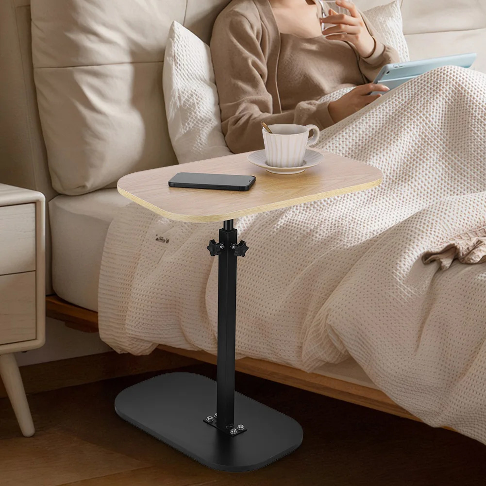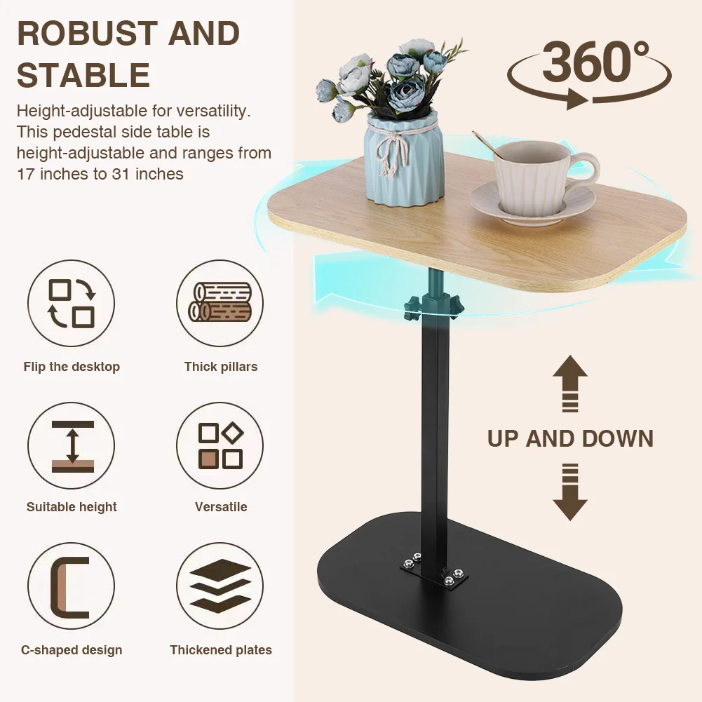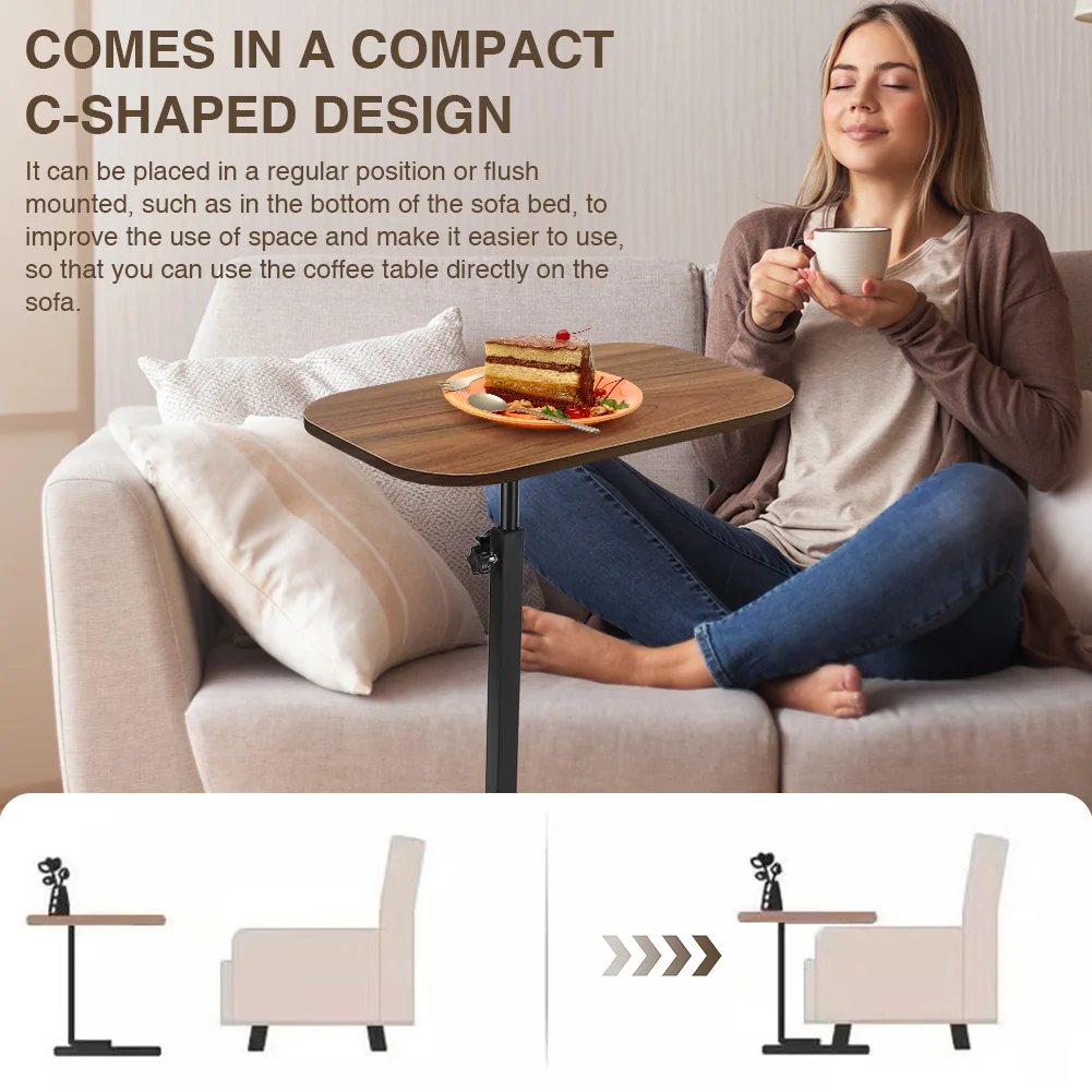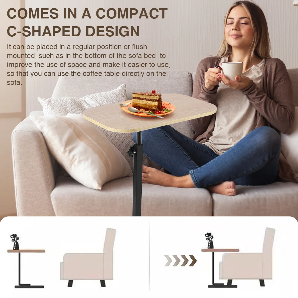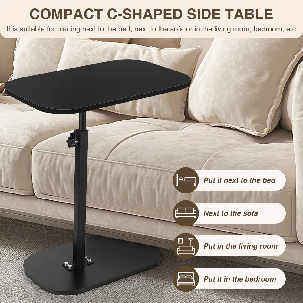 Features: 1.Compact C Shape Side Table: Designed with a tabletop measuring 17.7 inches wide x 11.8 inches deep, this c shaped side table seamlessly fits against your sofa, bed, or chair, maximizing convenience while saving floor space. 2.Adjustable Height Versatility: The small coffee table features an adjustable height from 17 to 31 inches, offering a flexible and versatile experience whether you’re on the sofa, bed, or elsewhere. 3.Multi-Purpose Design: This compact tea table can be used as a standard placement or embedded installation, such as fitting into the bottom of a sofa or bed, enhancing space utilization for easy access. 4.360 Degree Rotation Durability: With a tabletop that freely rotates to suit personalized angles, supported by a solid steel frame, this portable corner table has a 0.59-inch thick surface and can hold up to 50 lbs. 5.Quick & Easy Assembly: Comes with tools and clear instructions for simple assembly. Get your c shaped end table ready in minutes and start enjoying its functional benefits right away.