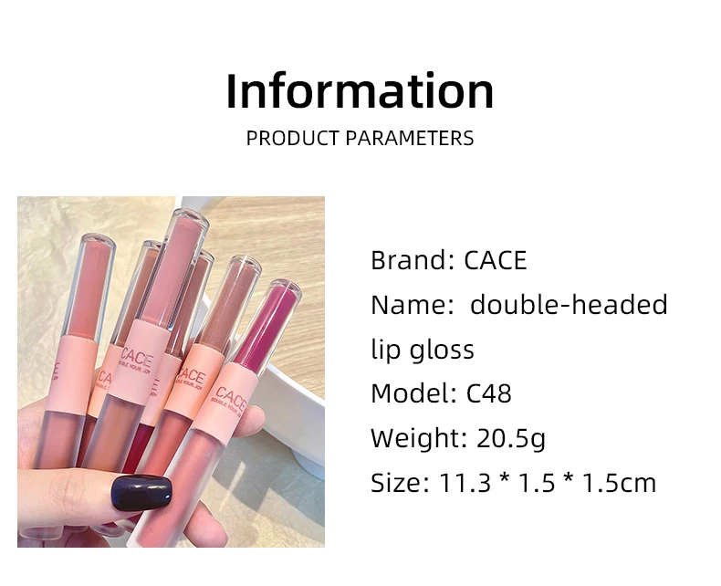 • Double Head Design :The CACE lip gloss features a unique double head design, allowing for precise application and blending of colors for a perfect lip look.