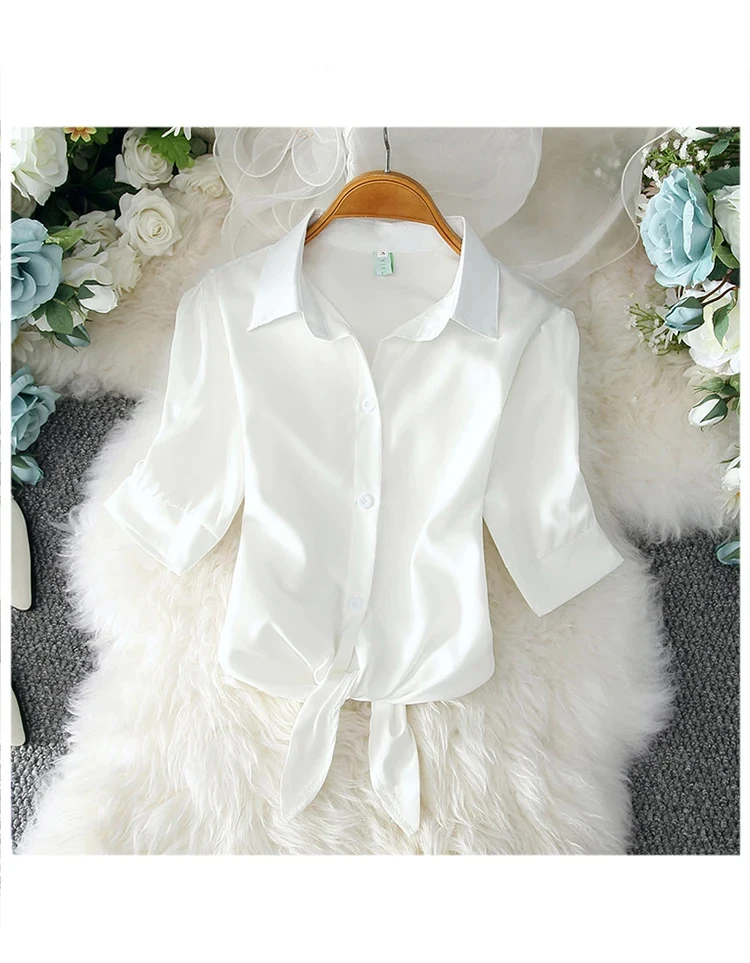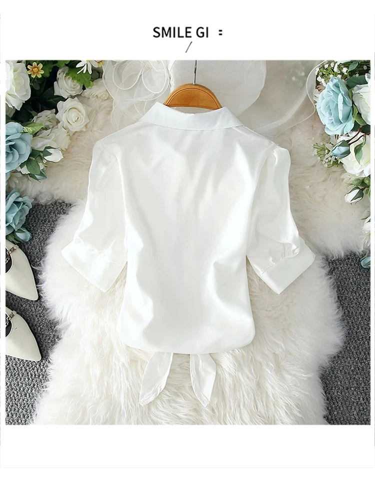 Casual White Blouse Summer Women Clothes Elegant Solid Button Short Sleeve Shirt Fashion Bow Belt Waist Office Lady Tops 19870