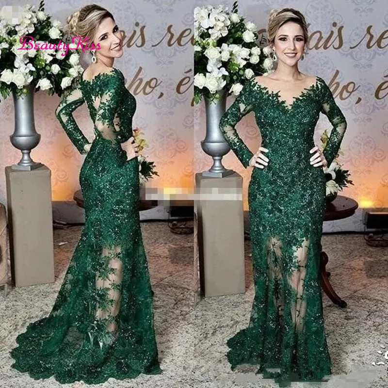 Charming Green Mermaid Lace Mother of the Bride Dresses Long Sleeve Wedding Guest Gowns Jewel Neck Beaded vestido de madrinha