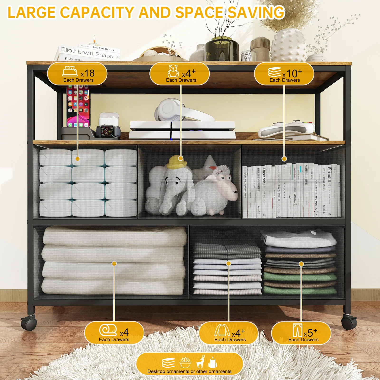 【Large Capacity Storage】The dresser equipped with 8 large separate drawers, provide ample storage space for different items in your family. And the drawer material is made of upgraded cationic fabric, which is highly superior, damage resistant, and ensures long-lasting performance.