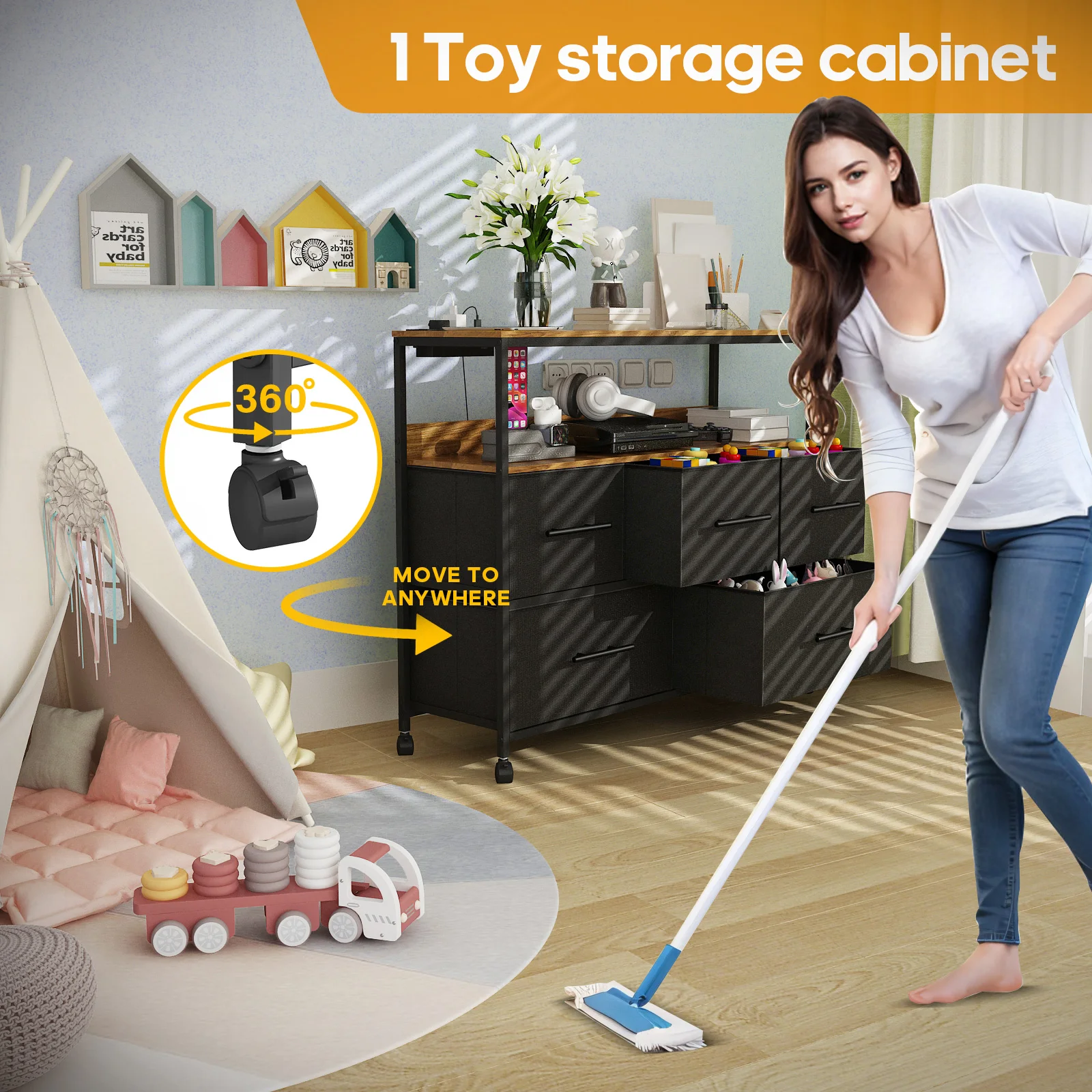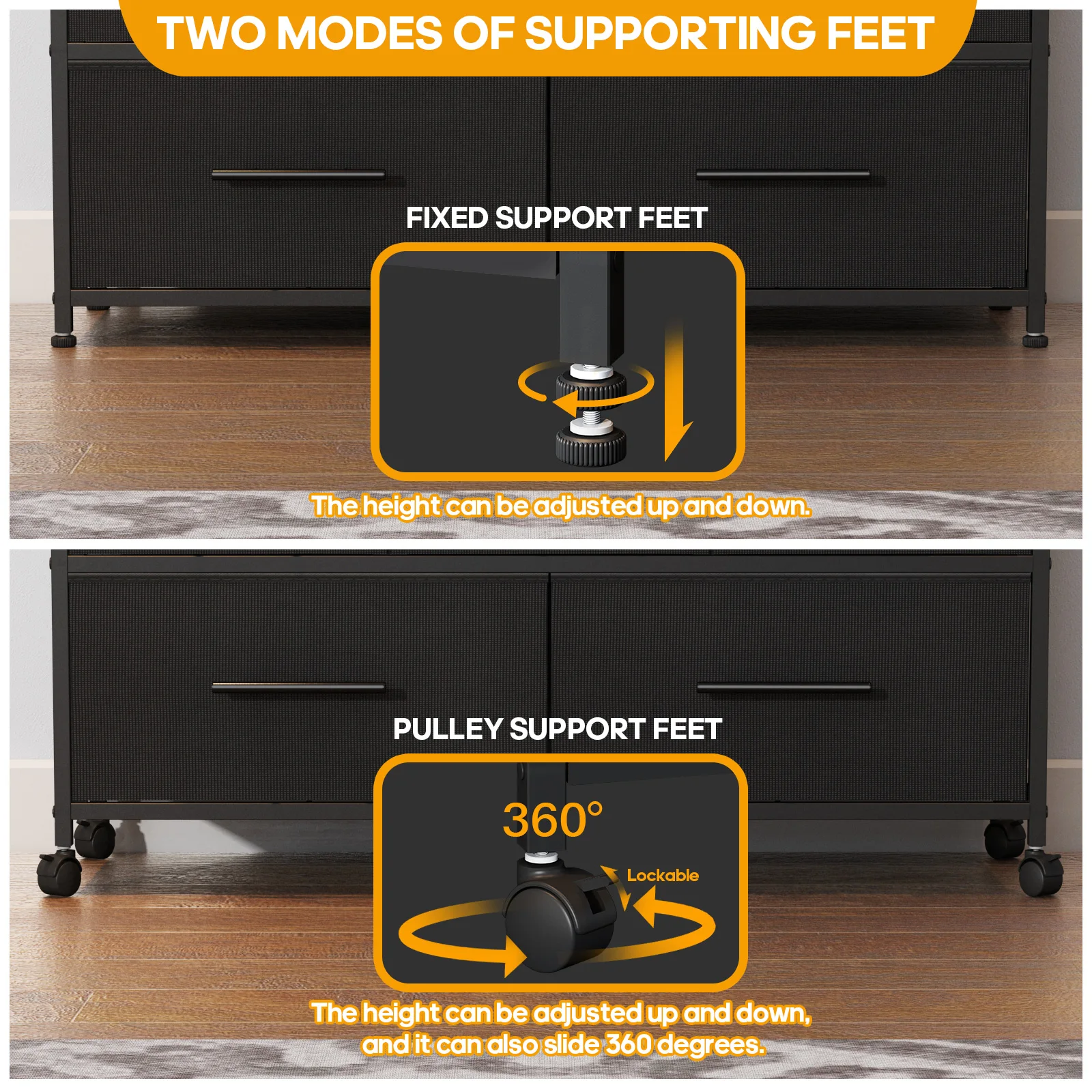 【Movable】This chest of drawers is equipped with additional 4 universal wheels, very convenient and flexible. When moving or cleaning, it can be moved with just one hand.
