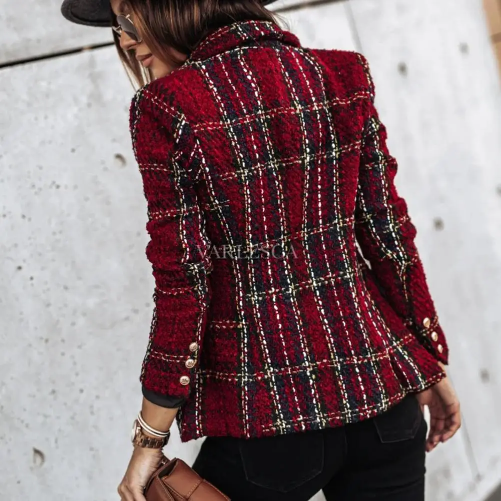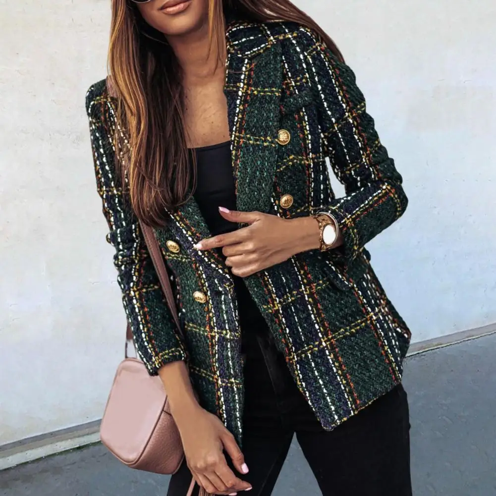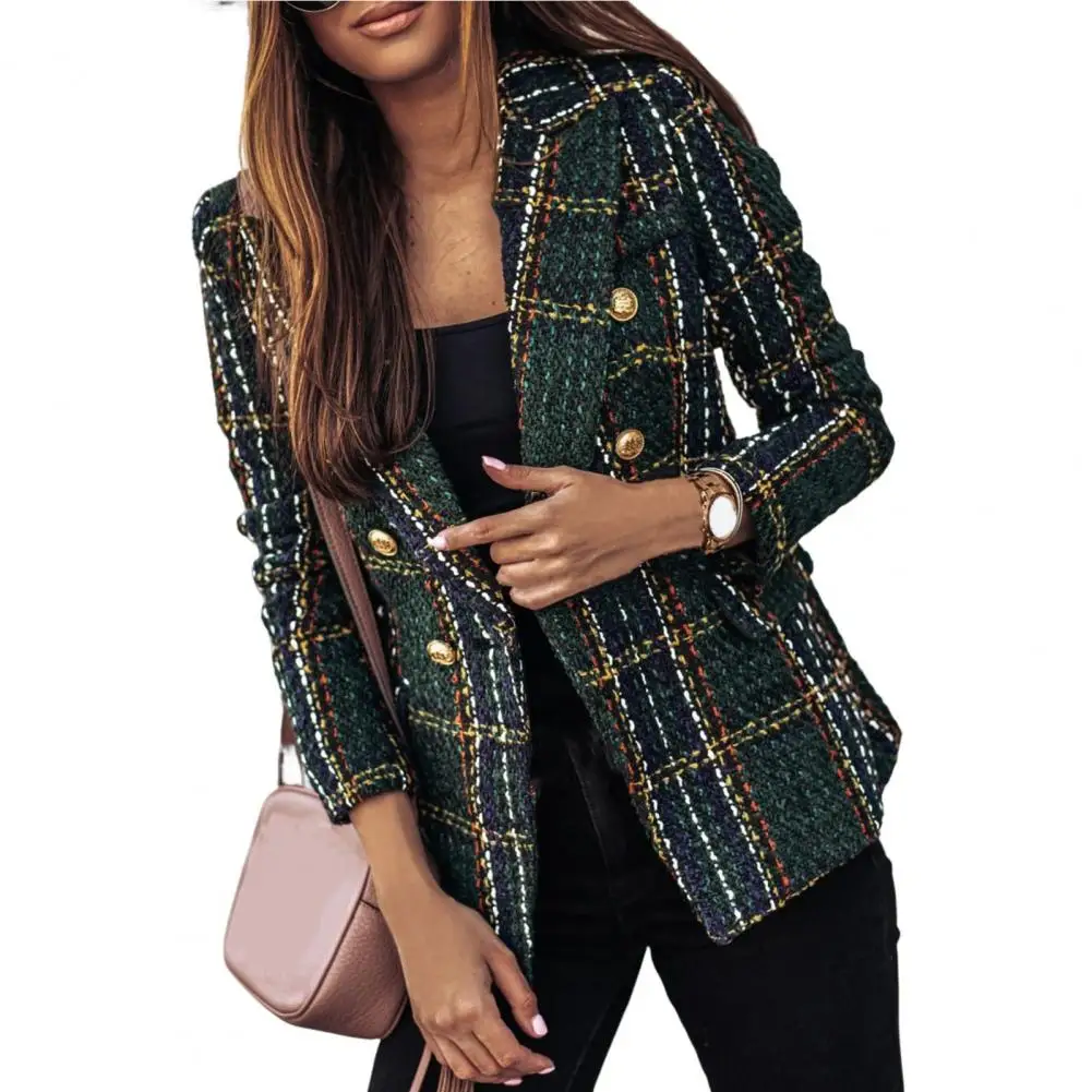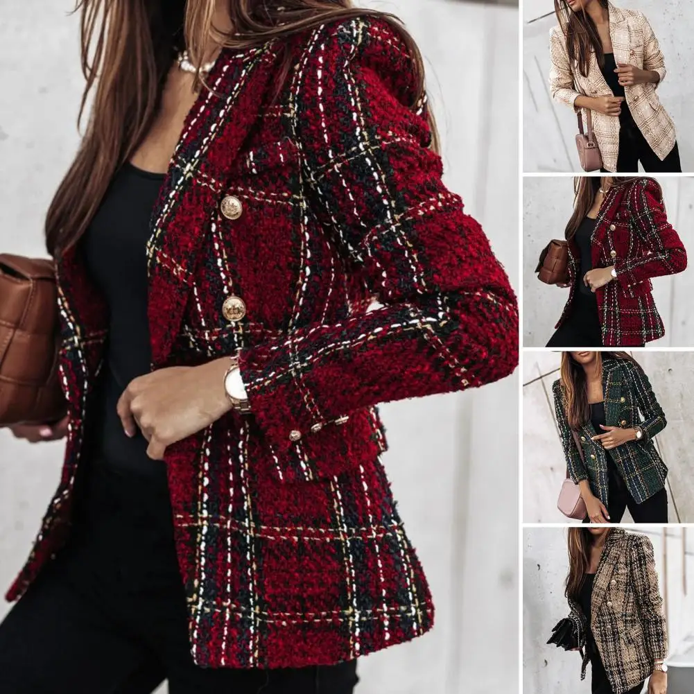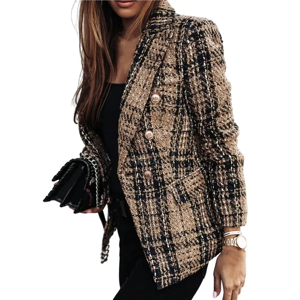 Women Blazer Double-breasted Plaid Print Lapel Long Sleeves Thick Warm Cardigan Formal Business Winter Coat Female Clothes