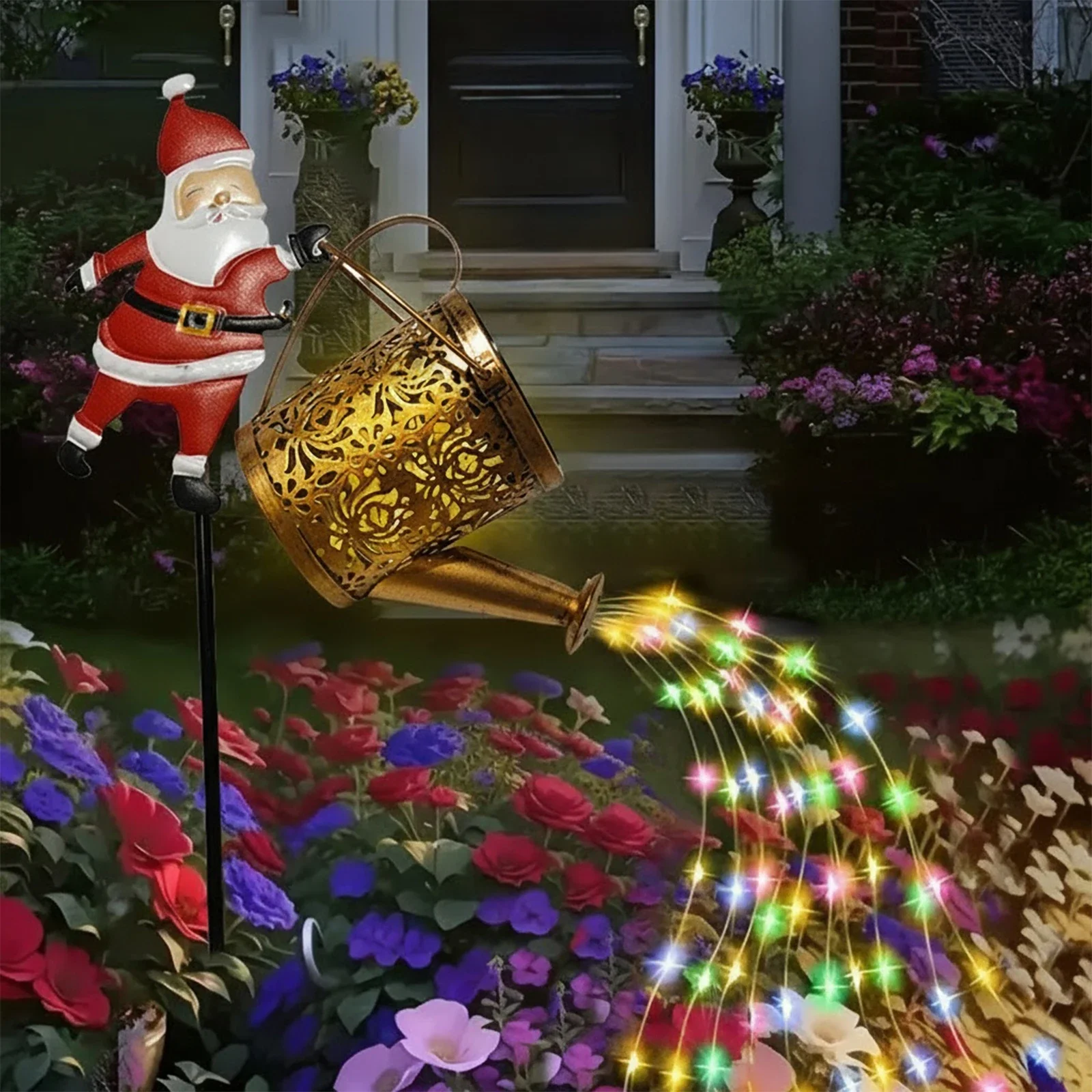 1.Unique Festive Santa Design: Enhance your holiday decor with this outdoor solar hanging kettle light featuring a lively Santa holding a watering can, bringing festive blessings and vivid color detail to your garden all day and night.