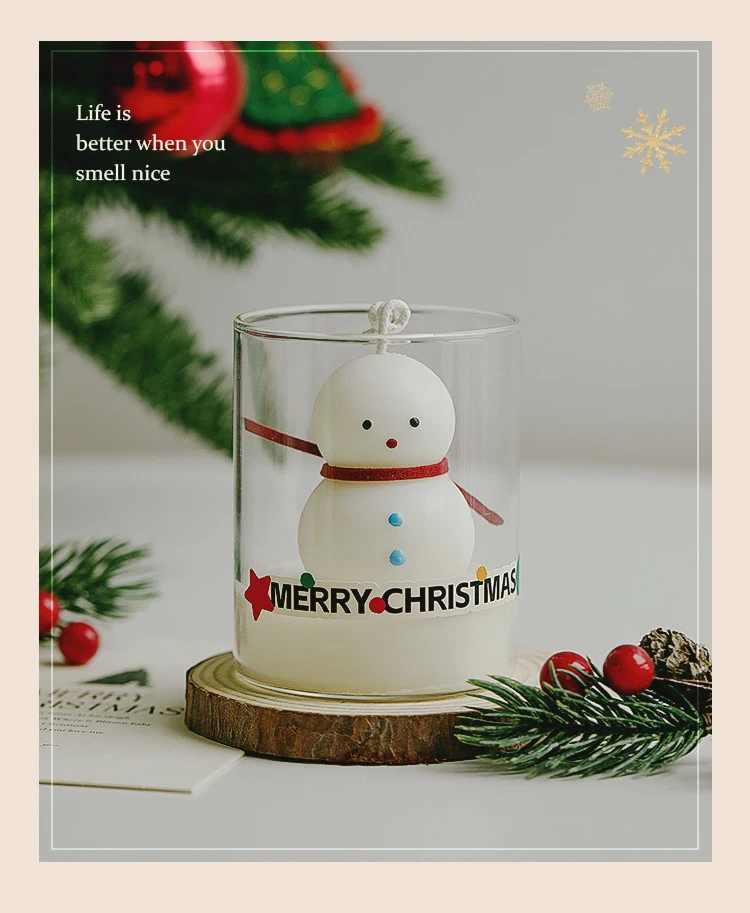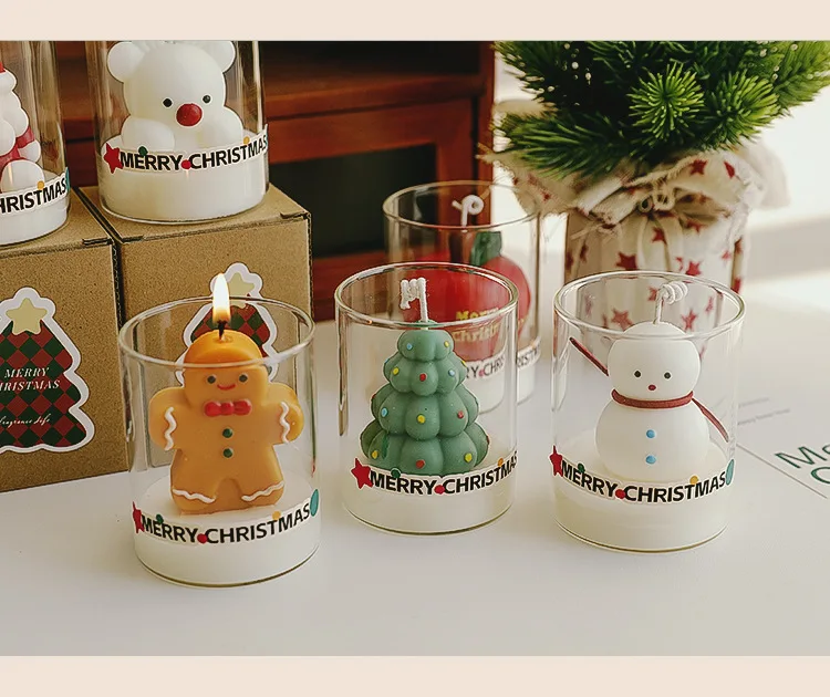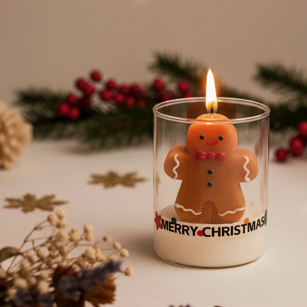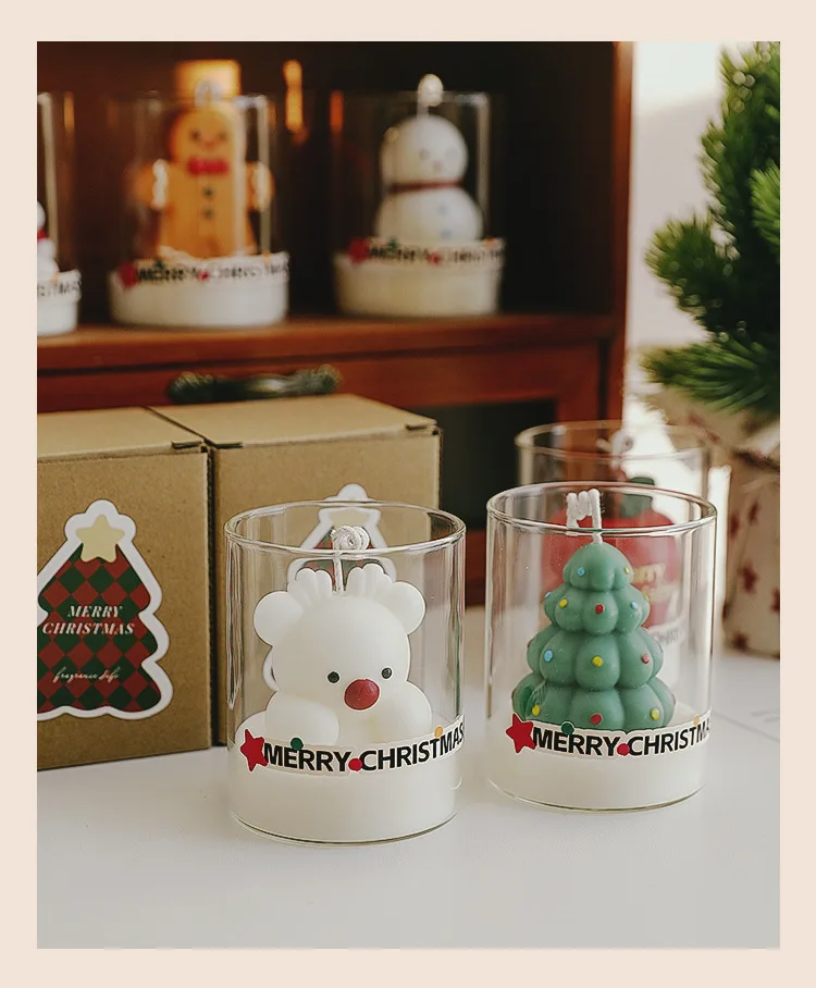 1️⃣ Christmas Scented Candle in Glass Cup – Handmade soy wax candle in a transparent glass jar, featuring adorable Christmas-themed shapes like Santa, snowman, Christmas tree, reindeer, and gingerbread man.