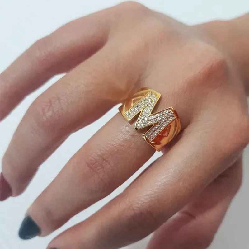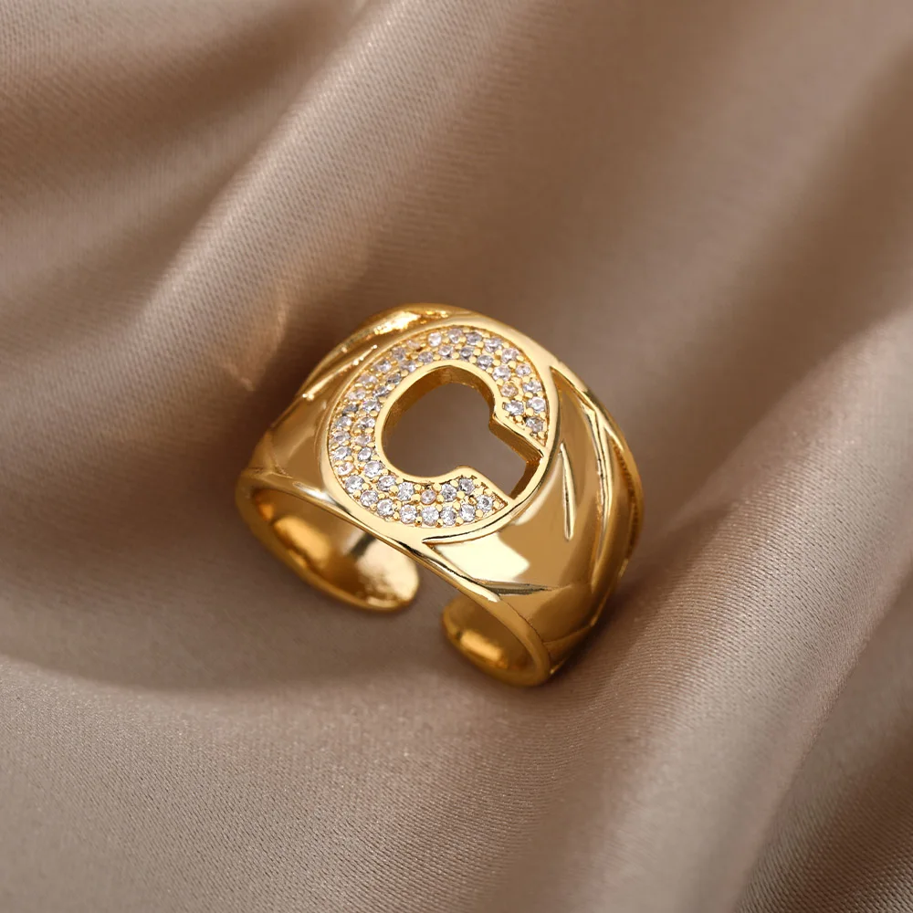 Chunky Wide Zircon Initial Letter Rings For Women Stainless Steel Opening Finger Ring Hip Hop Minimalist Jewelry Gift Femme
