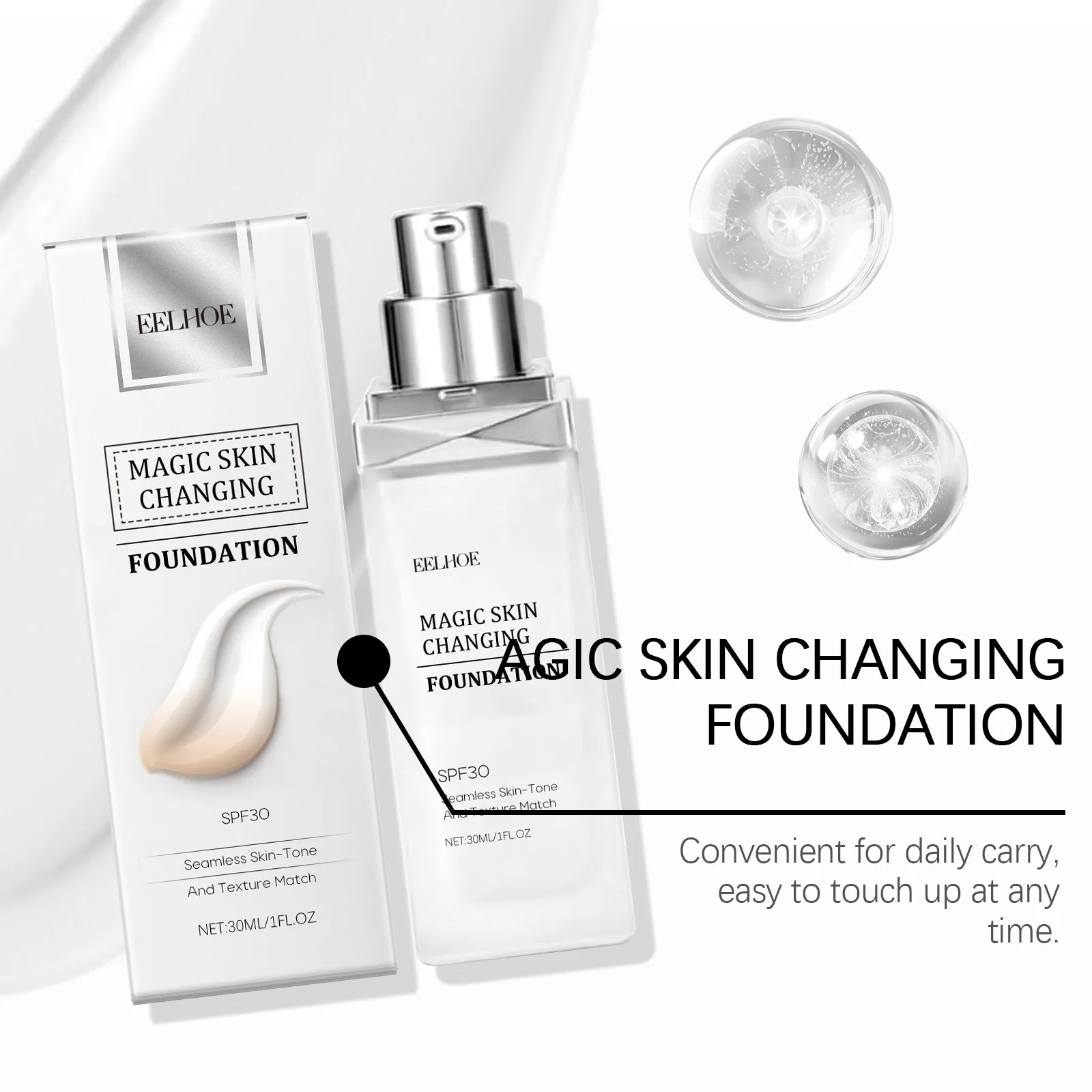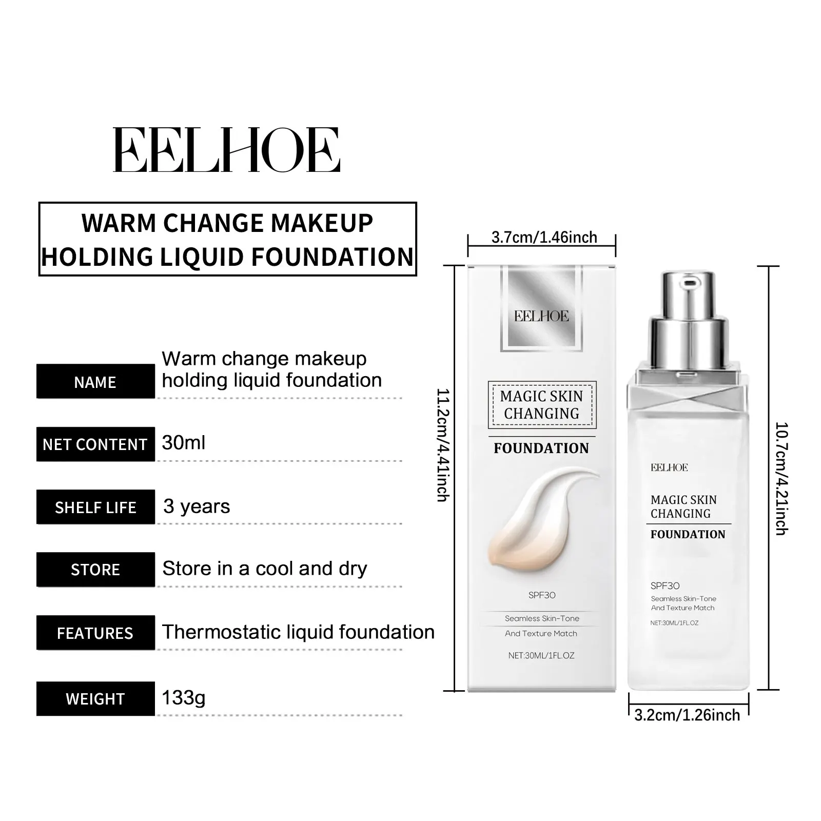 EELHOE Color Changing Foundation Hyaluronic Acid Waterproof Oil Control High Coverage Makeup Base Magic Covering Foundation Liquid 30ml