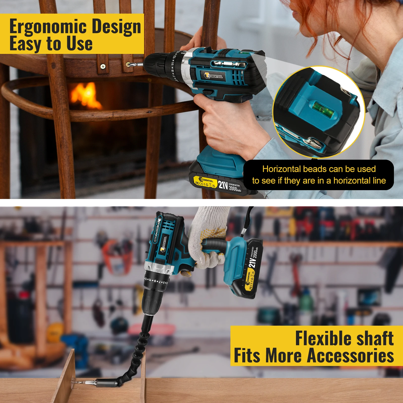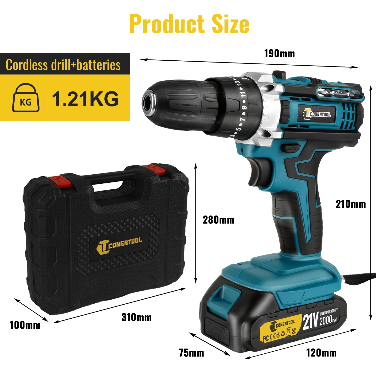 Conentool 25+3 Torque Impact Drill Electric Screwdriver Cordless Electric Hammer Drill Driver Lithium-Ion 2 Battery Power Tools