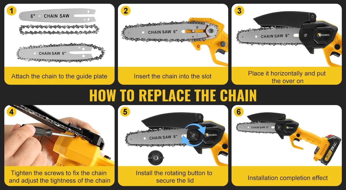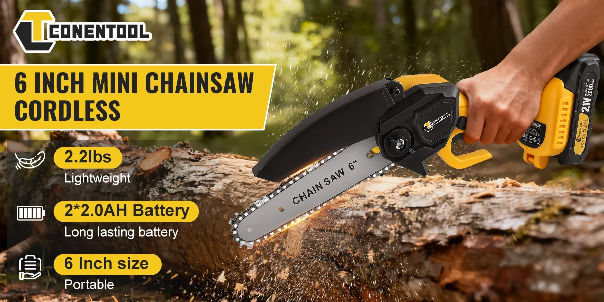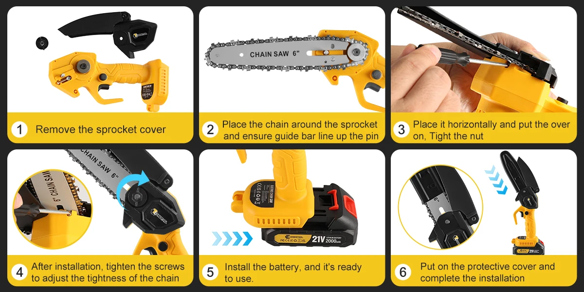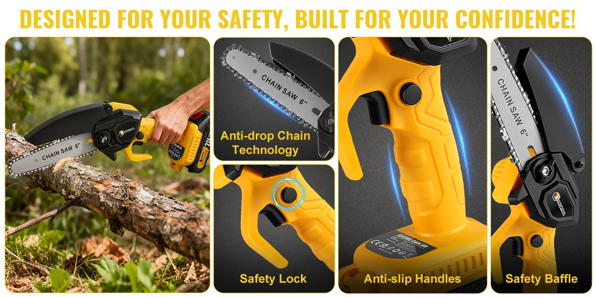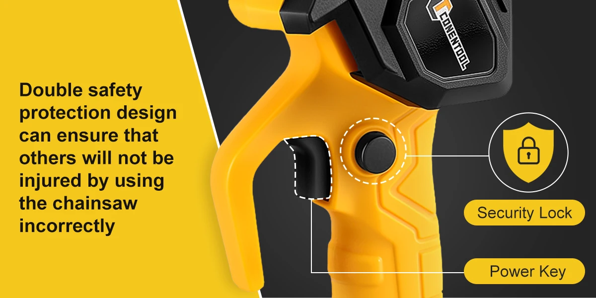 【Double security protection】With a dual-activation safety lock to ensure that it can only be started when two independent buttons are pressed at the same time, effectively preventing the risk of accidental triggering; In addition, The blade guard of the mini chainsaw is designed to prevent you from hurting yourself when using it, while also preventing wood chips from splashing onto you.
