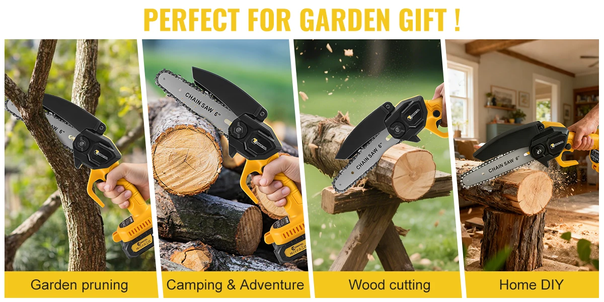 【Wide Application】Handheld small cordless mini chainsaw is perfect for wood cutting, Tree Trimming, gardening pruning, widely used in gardens, parks, farms, forests, ranches, orchards, greenhouses, an ideal present for new home owners, elderly, campers, DIYers.