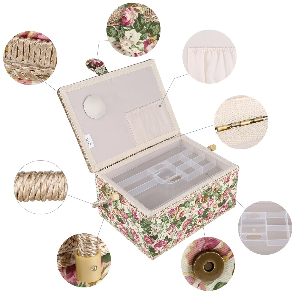 Craft Box Storage Box Sewing Box Fabric Floral Printed Sewing Basket Craft Box Household Sundry Storage Organizer with Handle