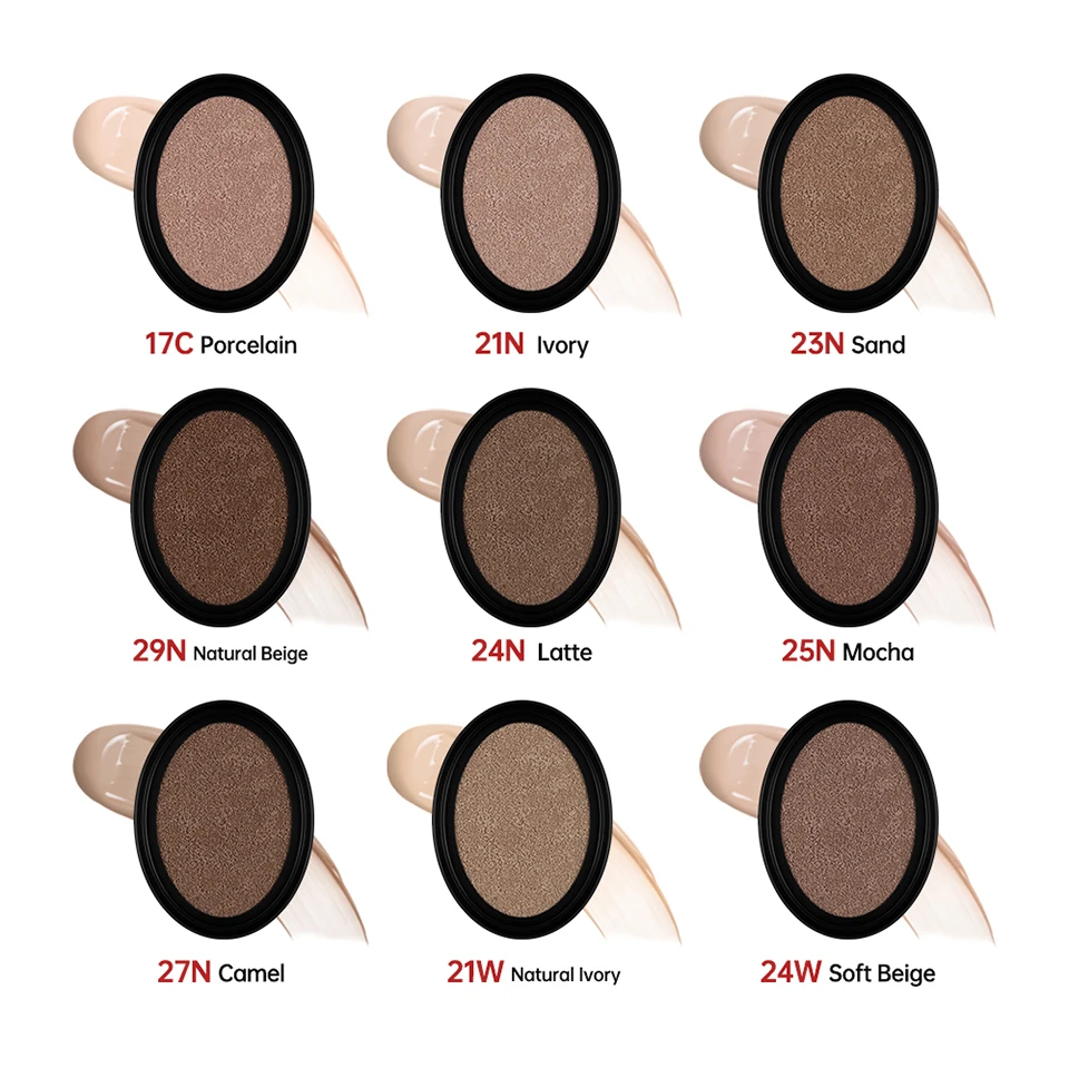 The adhesion cushion foundation, enriched with light powder and skincare ingredients, ensures a long-lasting fresh makeup look.