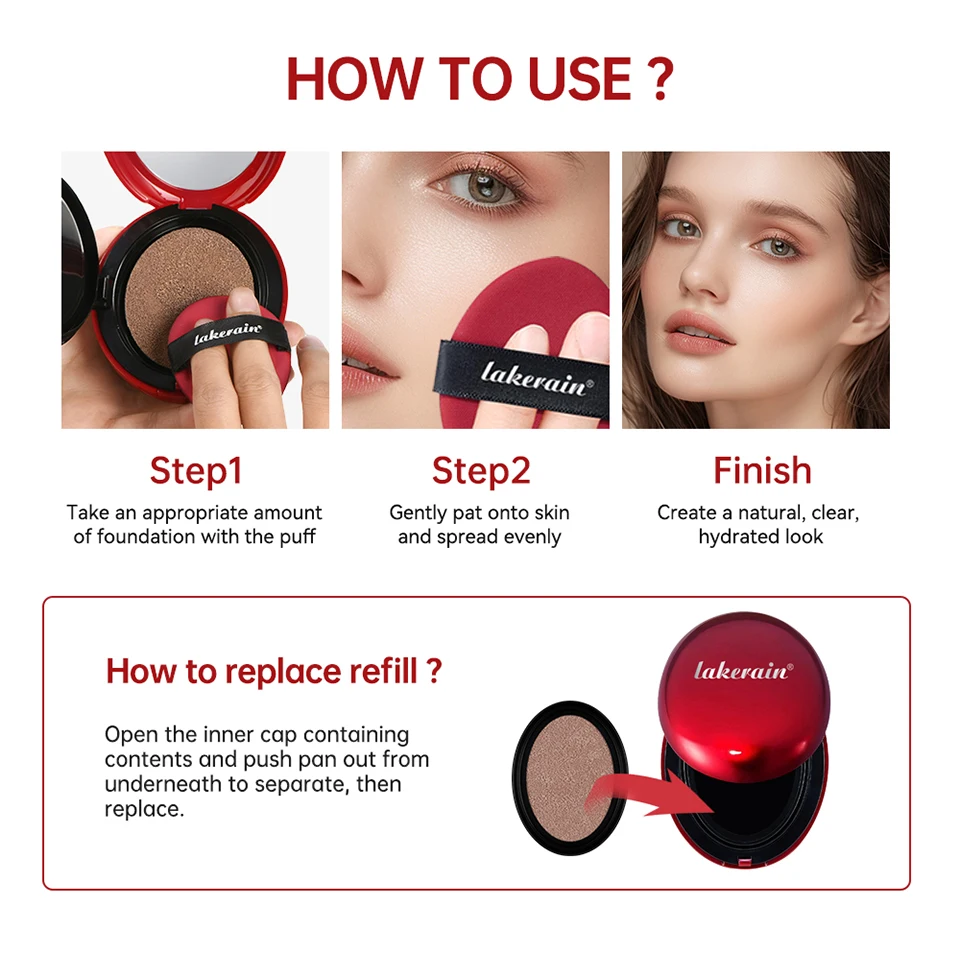 Press the cushion down to release the desired amount of foundation, then take an appropriate amount with the puff and gently tap it onto the skin for an even spread.