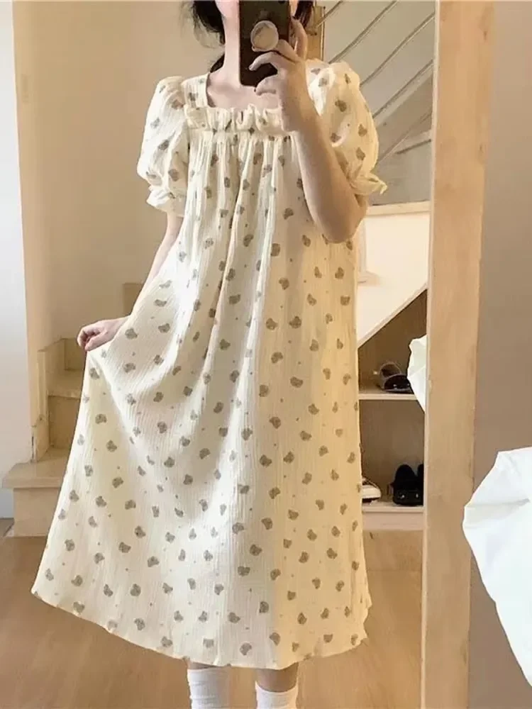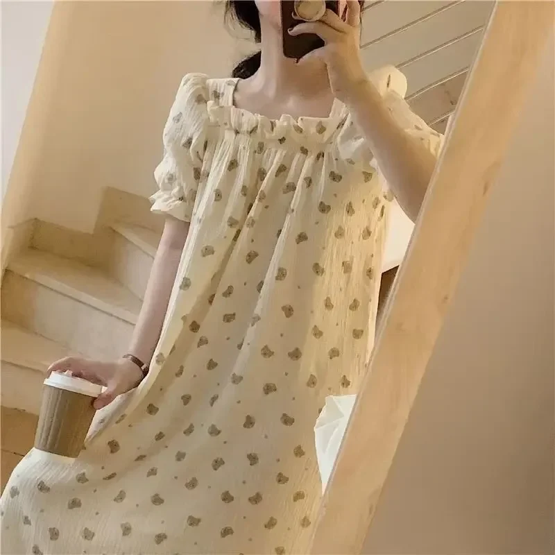 Cute Nightwears Mid Length Korean Version Women’s Home Wear Dress New Pajamas Sleepwear Women’s Cotton Clothes for Sleep Summer