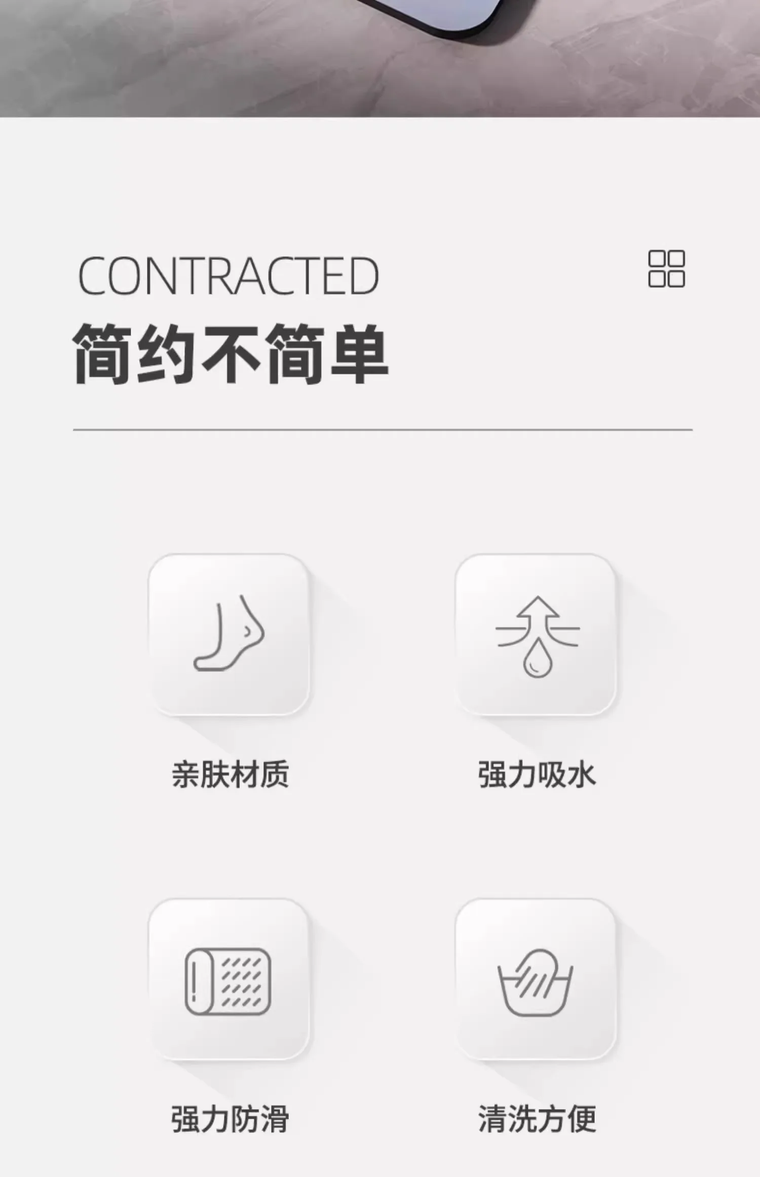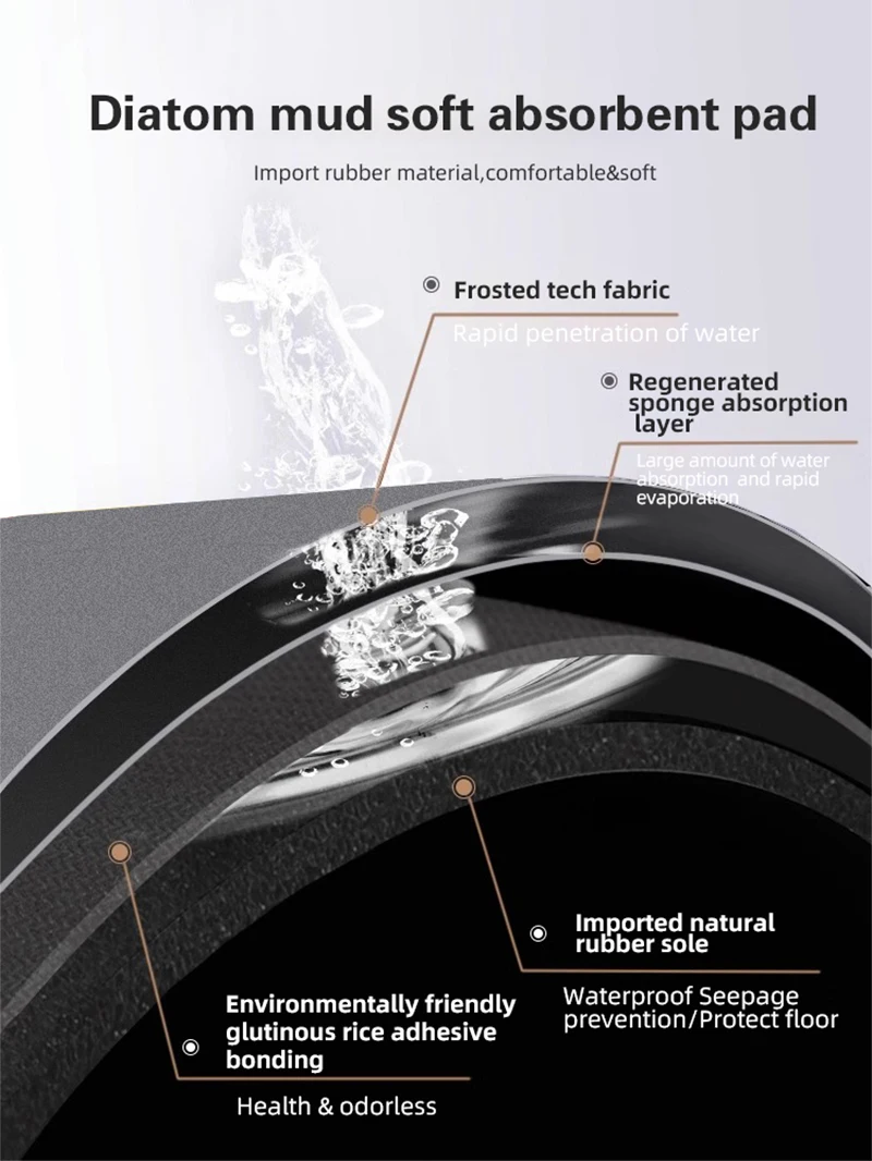 2.Diatom mud fabric surface can absorb moisture quickly; Foam absorbent layer can absorb water instantly and evaporate quickly.