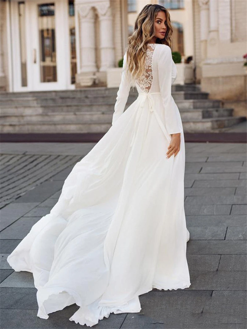 DREAM Customized Chiffon Illusion Back Long Sleeve Boho Wedding Dress Simple V-Neck Appliques Bridal Gown Vintage Bohemian 2025