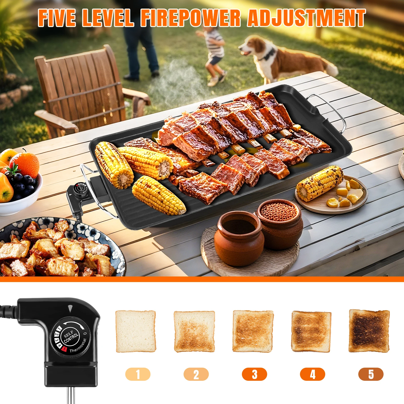 ⭐【Adjustable Thermostat】– Featuring five temperature settings, you can manually adjust it to the ideal heat for different foods, enhancing their flavour and offering greater flexibility than most barbecues on the market. Additionally, it automatically shuts off when the grill plate exceeds its rated temperature, ensuring safer, worry-free use!
