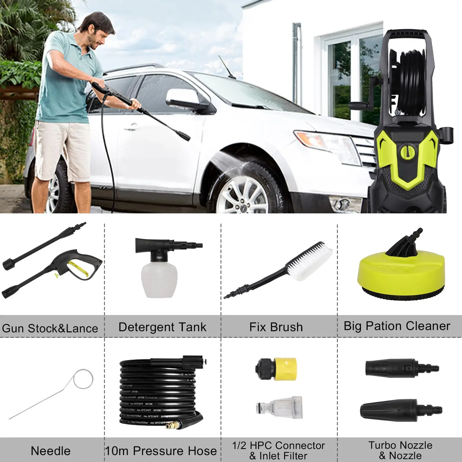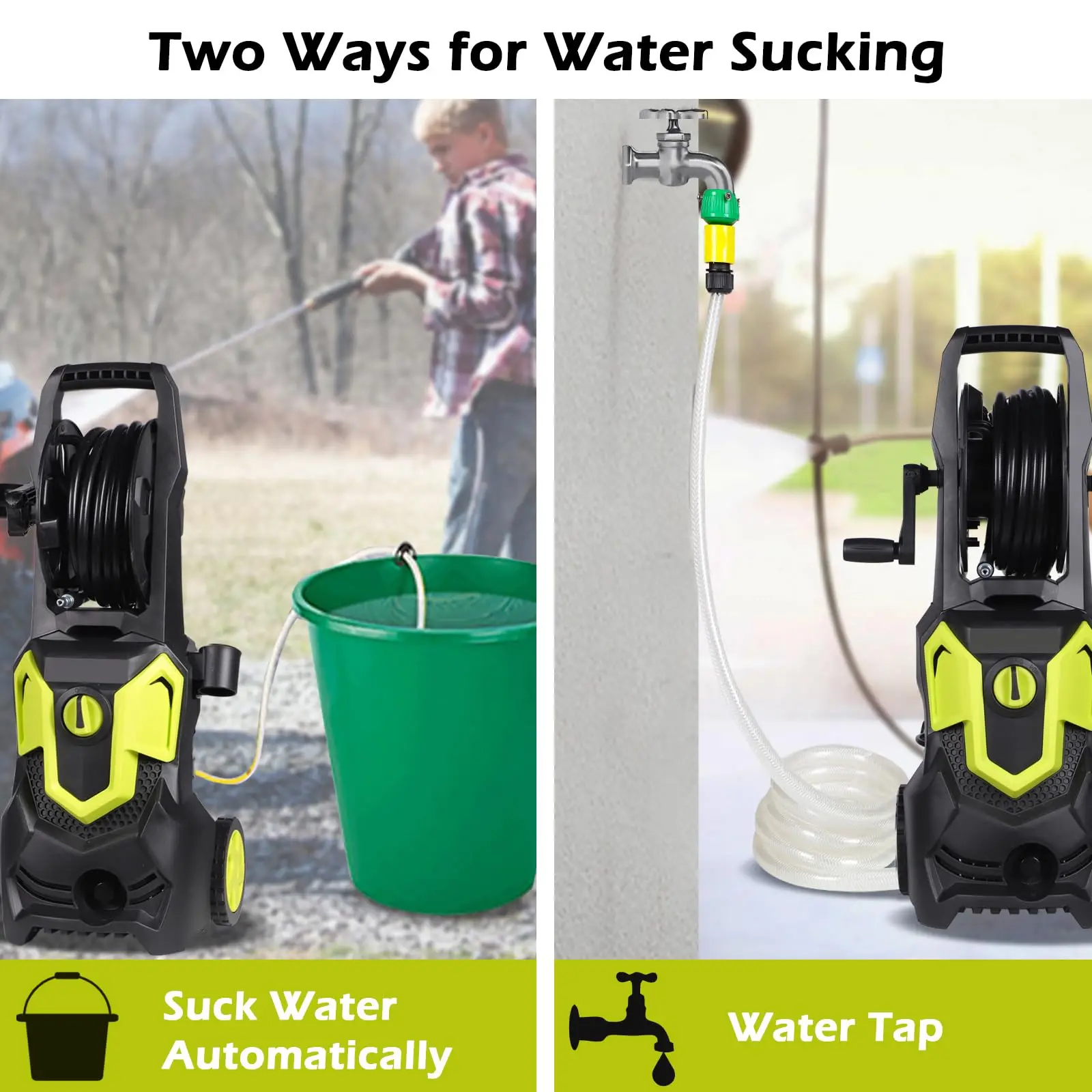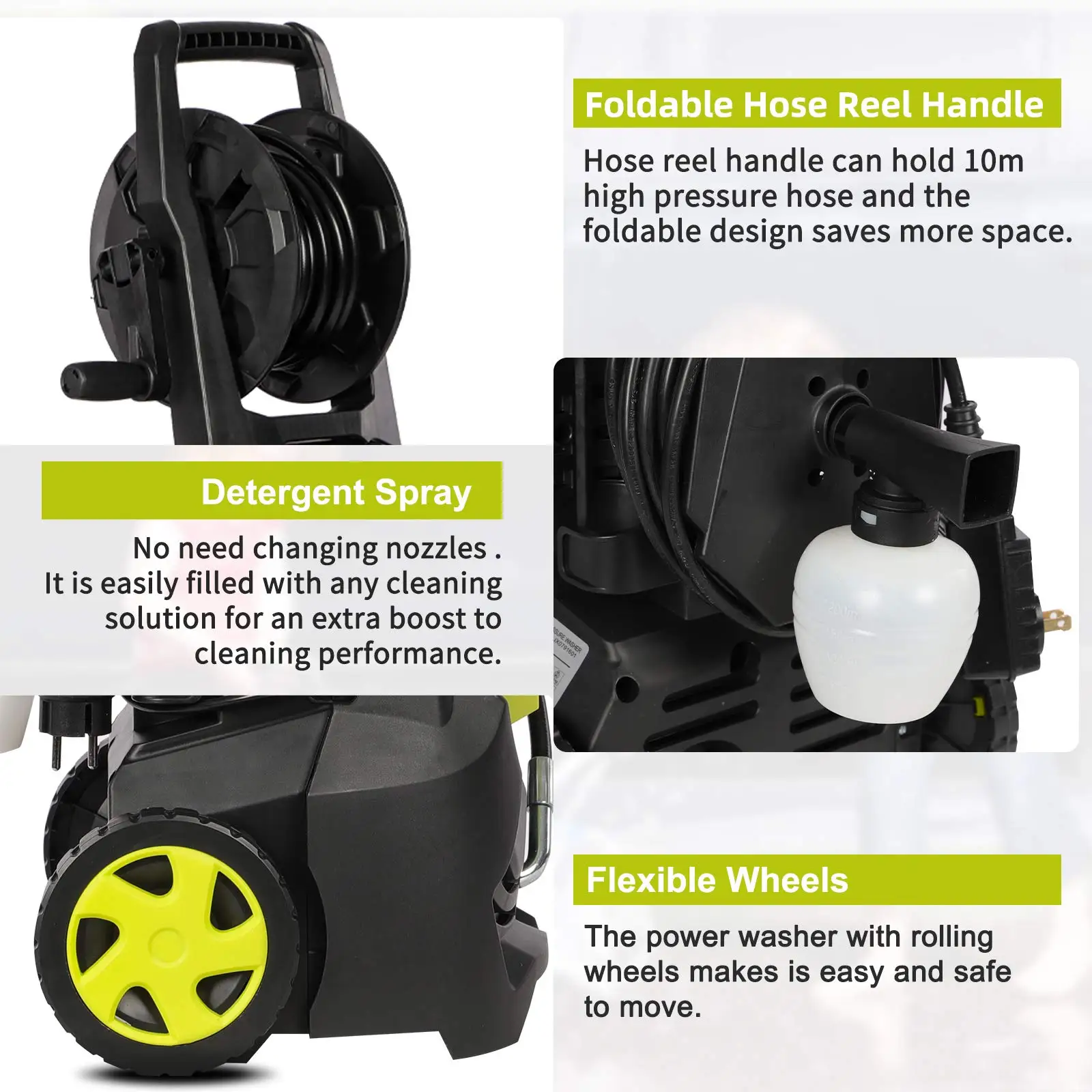 【On Board Hose Reel】—32ft electric high power washer hose is long enough for the projects you need it for, the built in on-board hose reel to conveniently protect and helps prevent kinks in the high-presure hose and makes winding or unwinding a simple task.