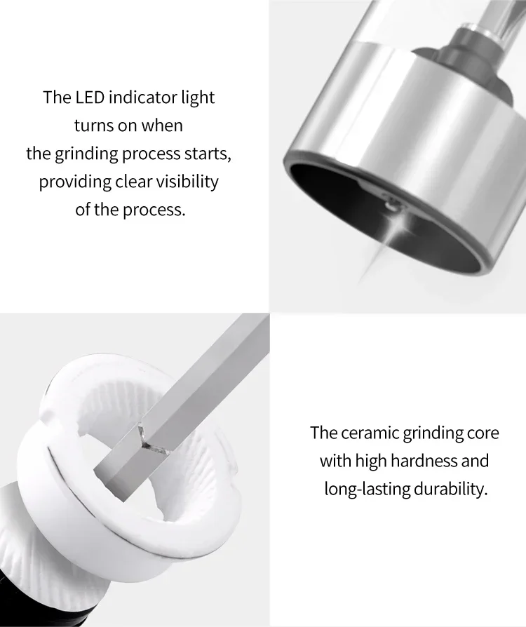 Creative Design – The LED light is installed in the upper part of the pepper mill body instead of the container. By clever light refraction, the white light can shine through the container and illuminate the food directly, convenient to clean up the container with water