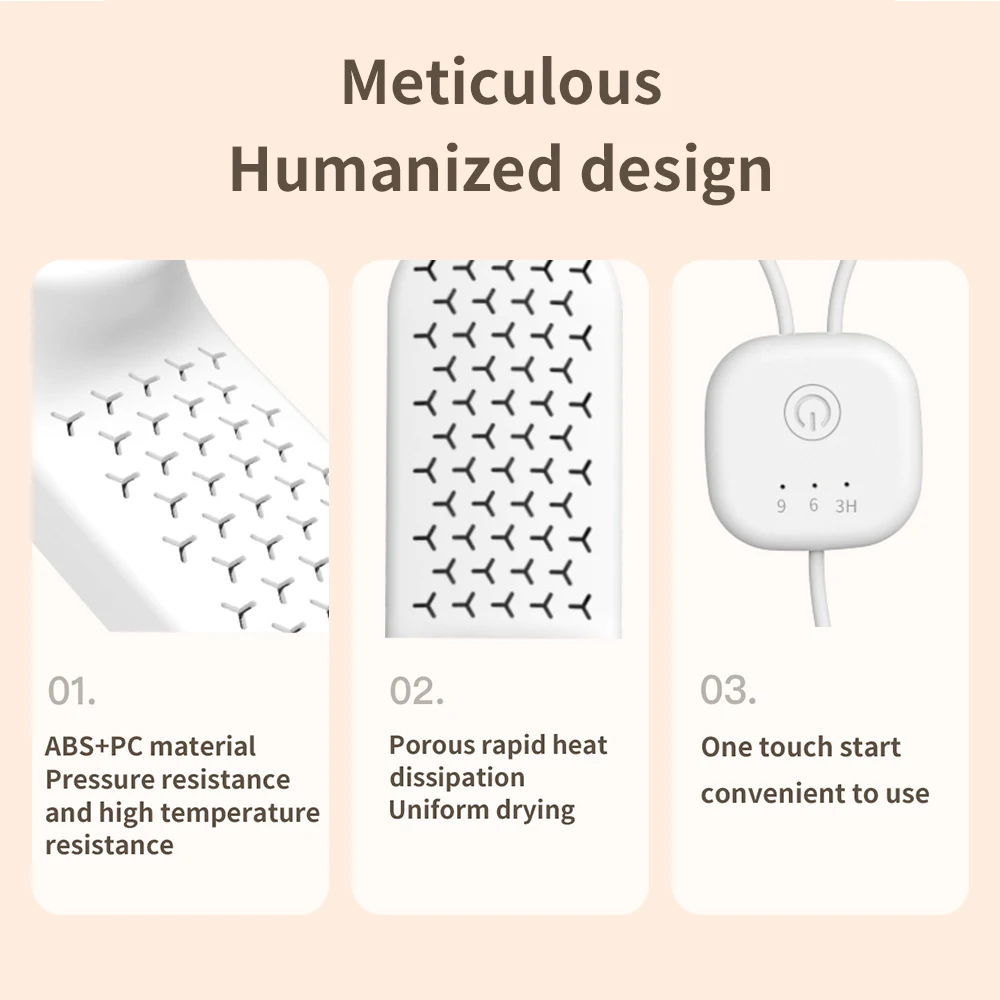 1. 360° circulating constant temperature heating distributes heat evenly, quickly drying shoes without damaging them, keeping shoes dry and clean.