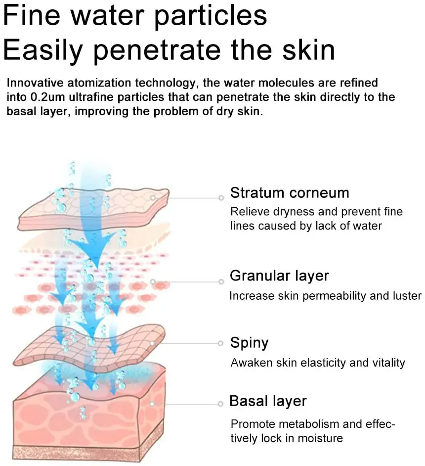 It adopts advanced technology to generates nano ionic cool mist, penetrate into the basal cell layer of the skin, which is up to 10x more deeply moisturizing skin.