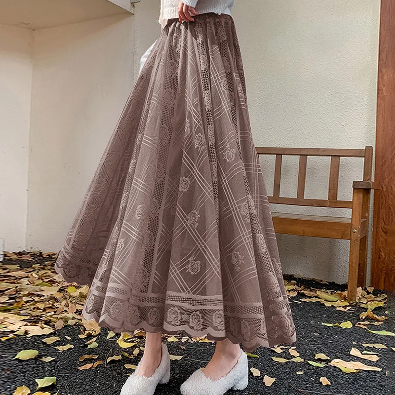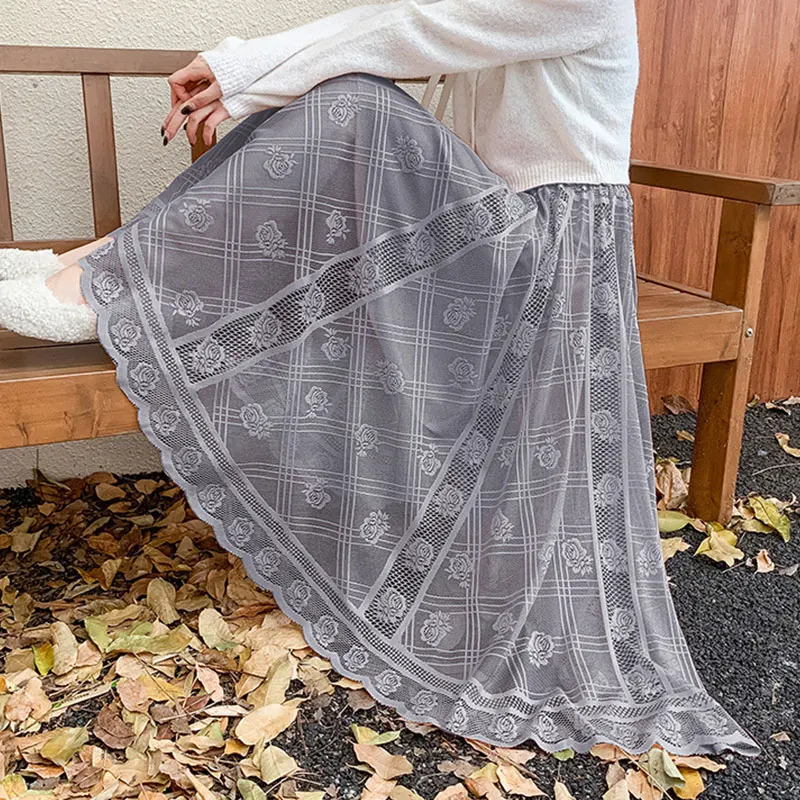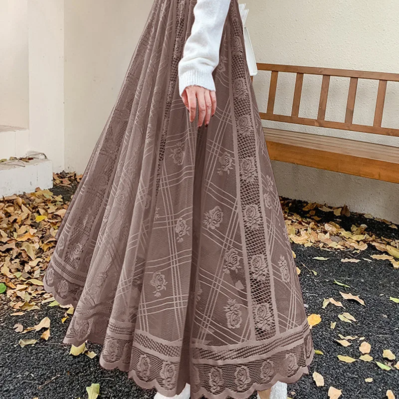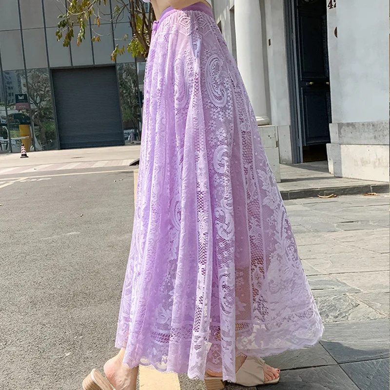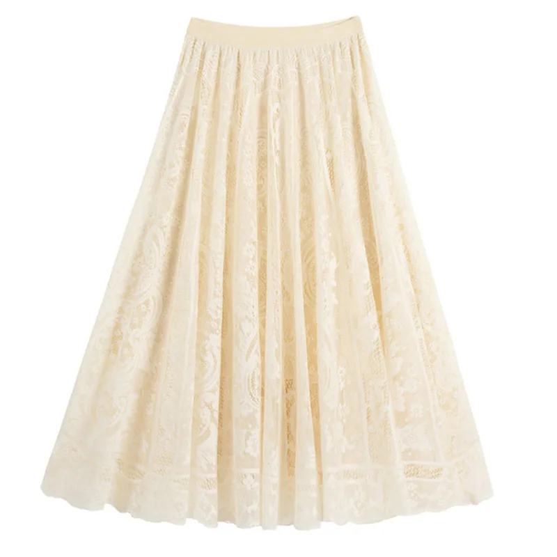 Women Elegant Lace Long Skirt Summer Casual Irregular Hem A Line High Waist Maxi Skirts Female Seamless Mid Length Skirt
