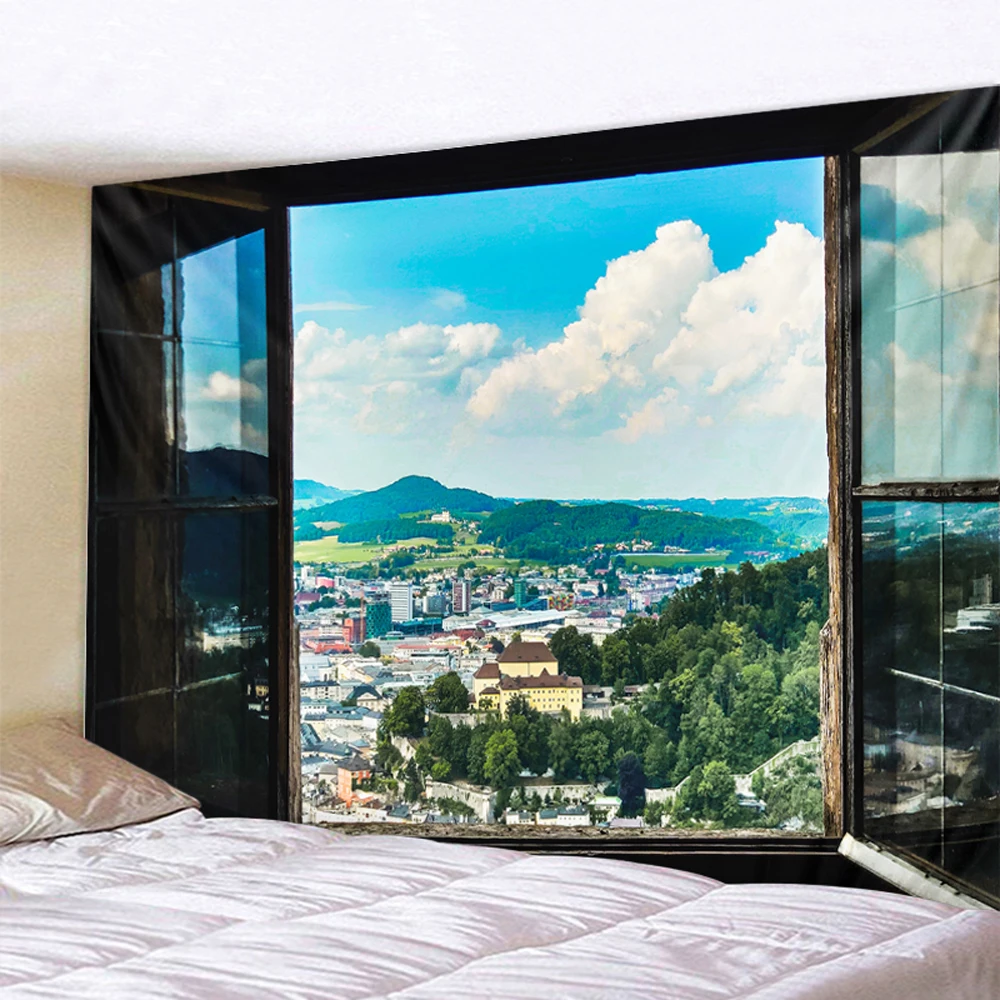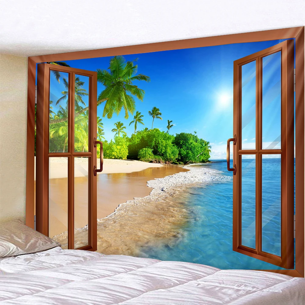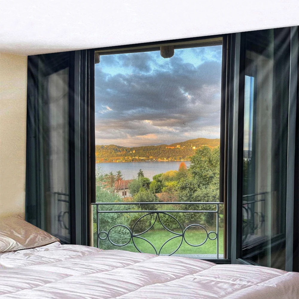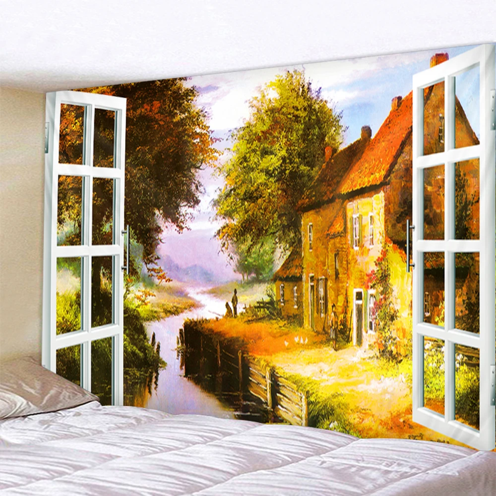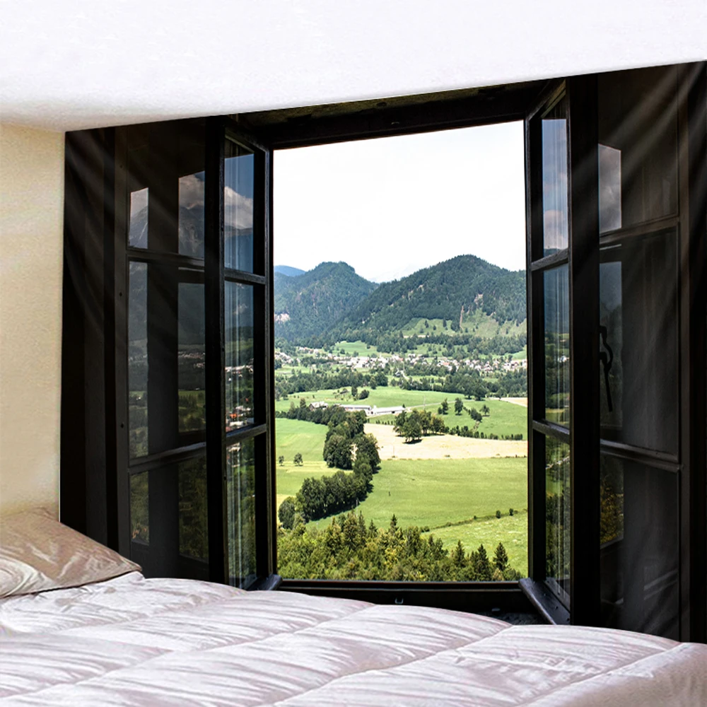 European-Style 3d Window Scenery Wall Hanging Tapestry Bohemian Art Deco Blanket Curtain At Home Bedroom Living Room