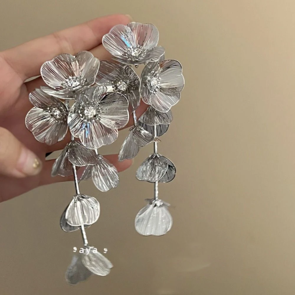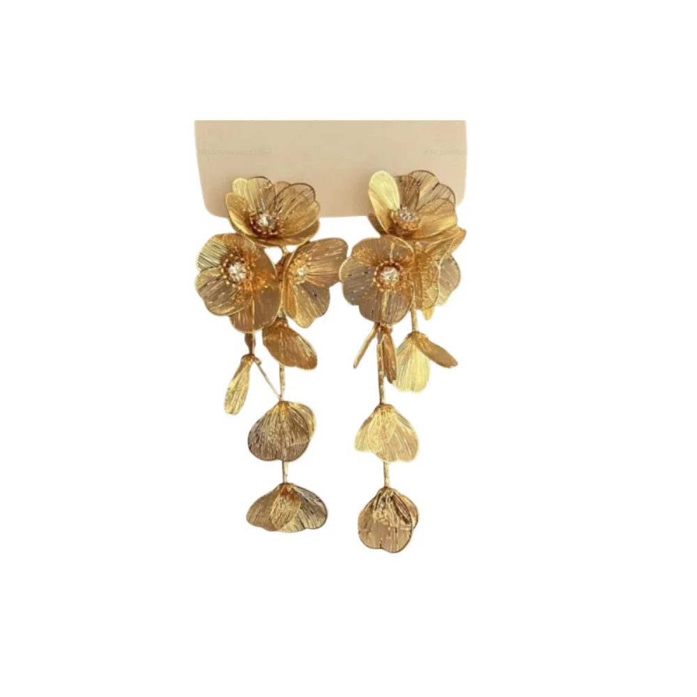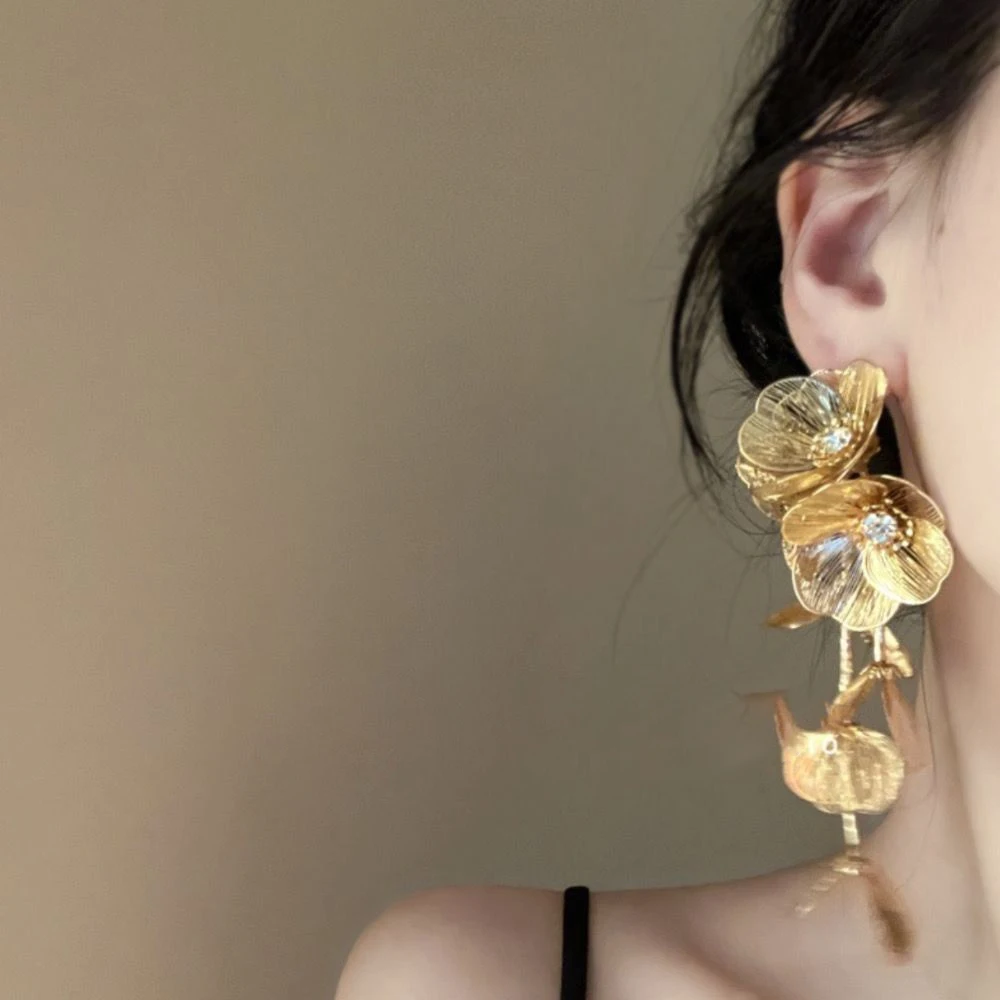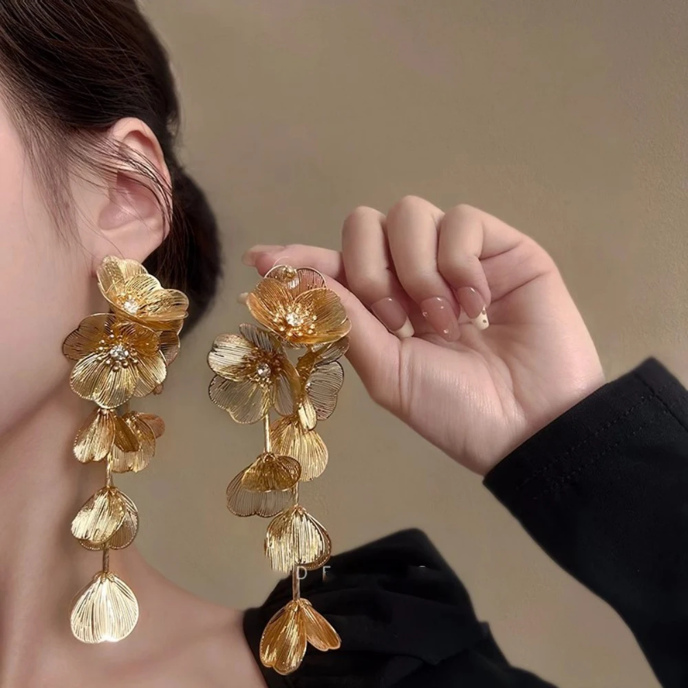 Exaggerated Gold Color Big Petal Flower Tassel Drop Earrings For Women Exaggerated Metal Earrings Fashion Jewelry Accessories