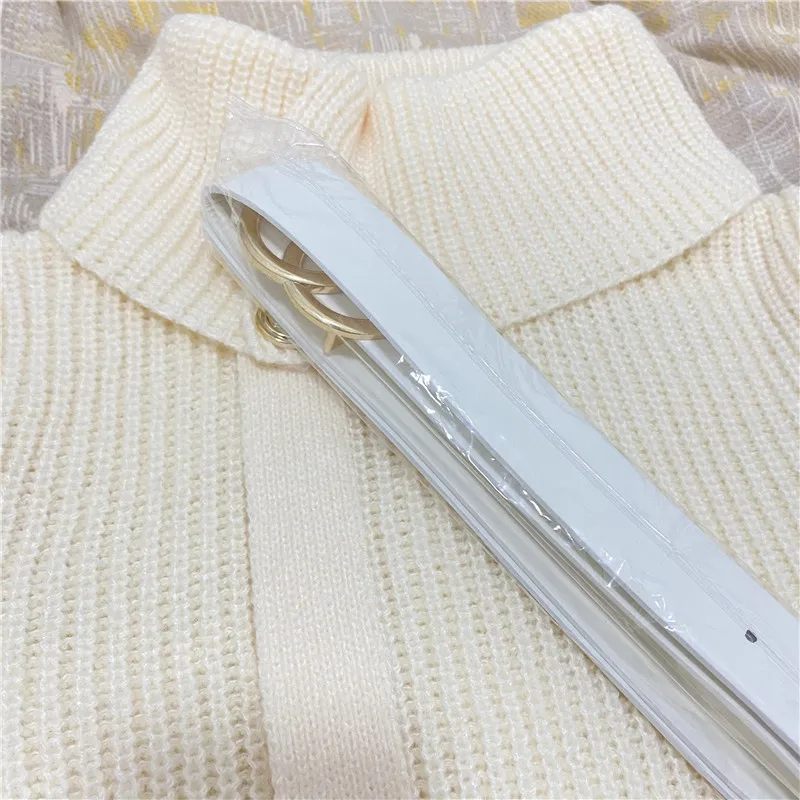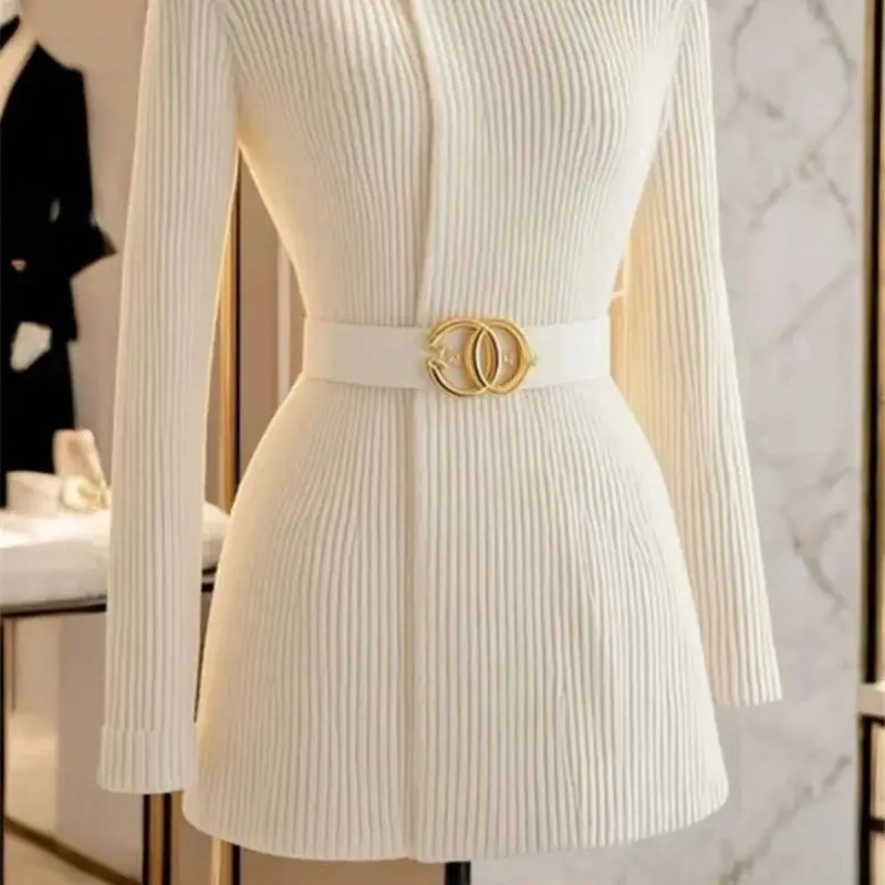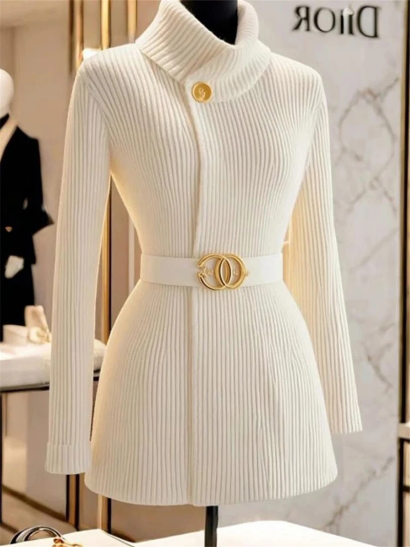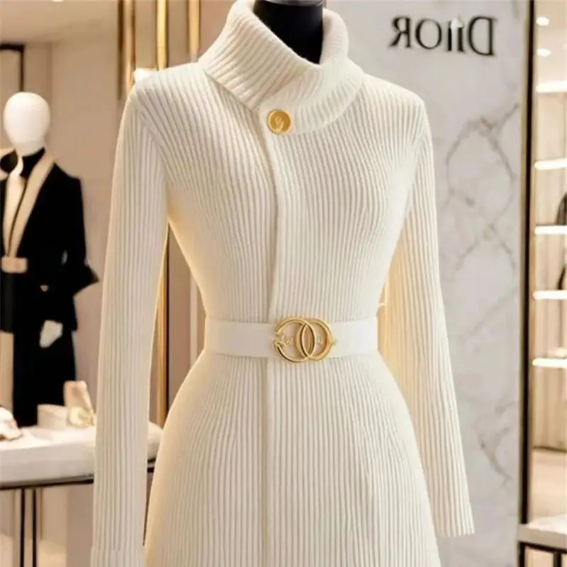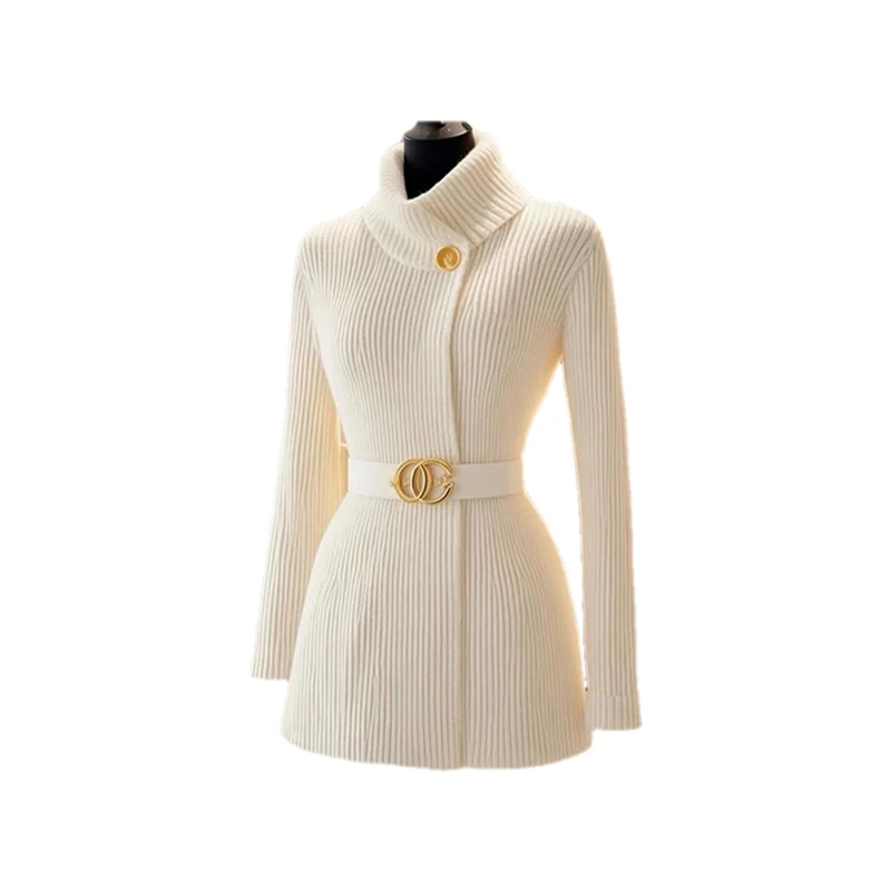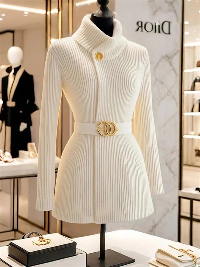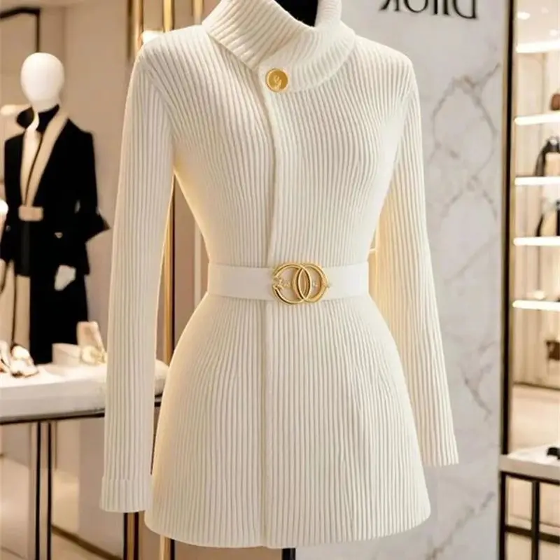Fashion Belt Wool Sweater Women Autumn Winter High End White Thick Knit Pullover Celebrity Turtleneck Long Knitwear Stylish 058H