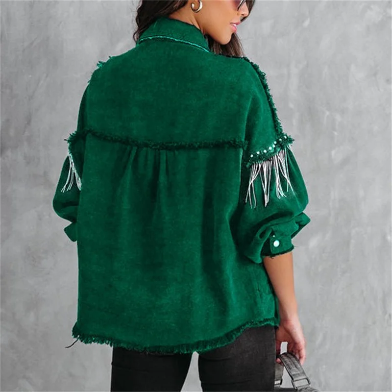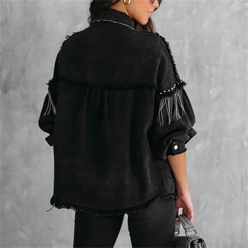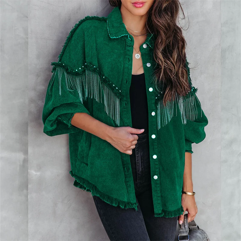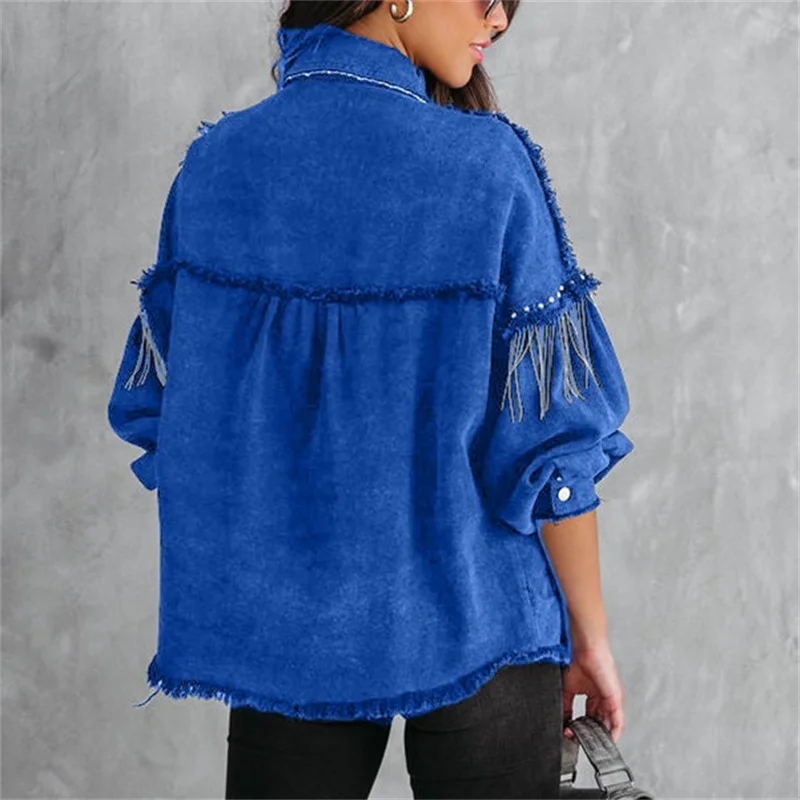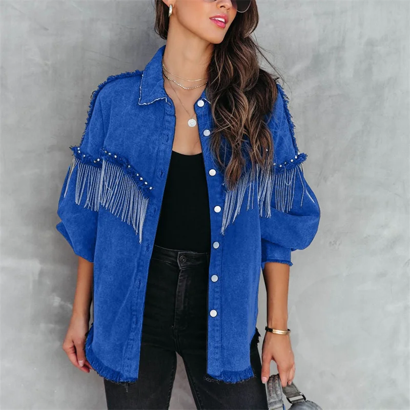 Fashion Chain Splicing Decoration Jacket Women Vintage Tassel Denim Coat Female Single-breasted Cardigan Casual Loose Outerwear