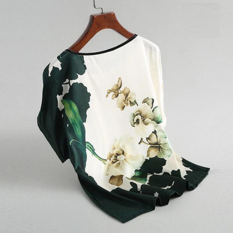 Fashion Floral Print Blouse Pullover Ladies Silk Satin Plus Size Batwing Sleeve Vintage T-shirt Casual Short Sleeve Tops
