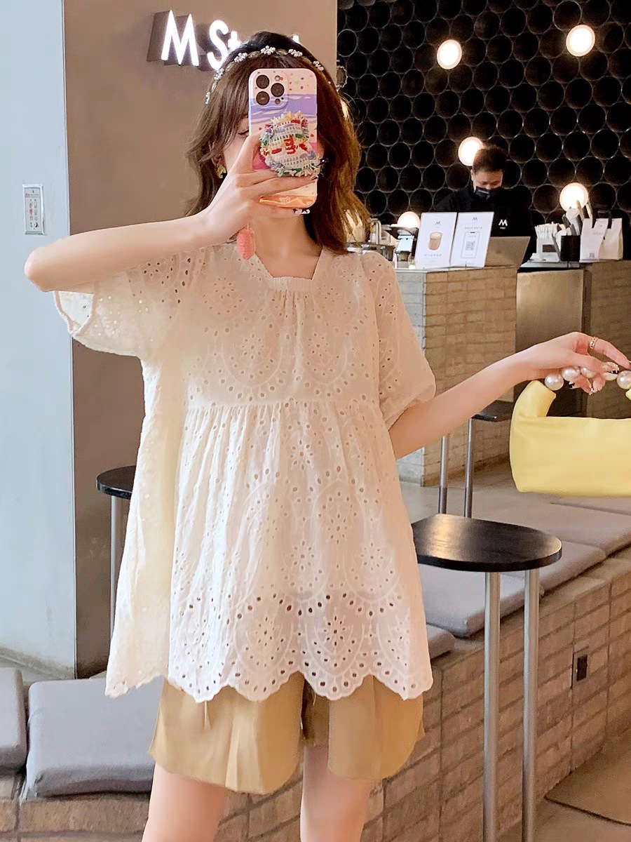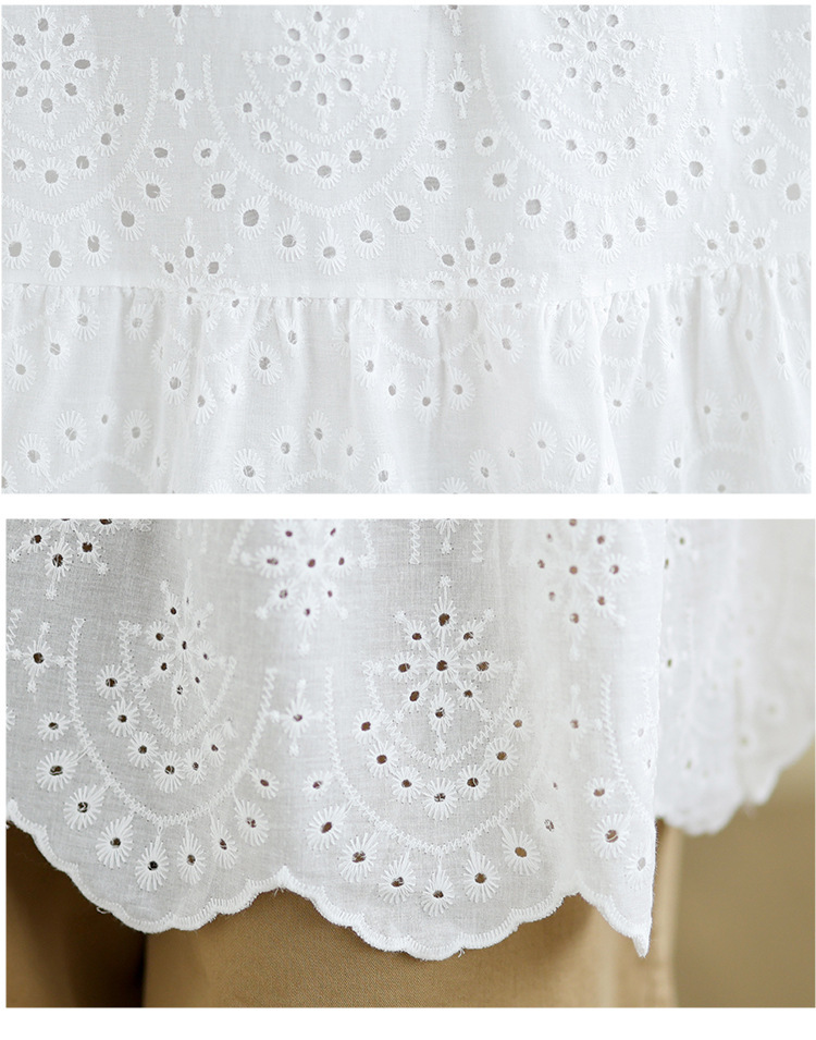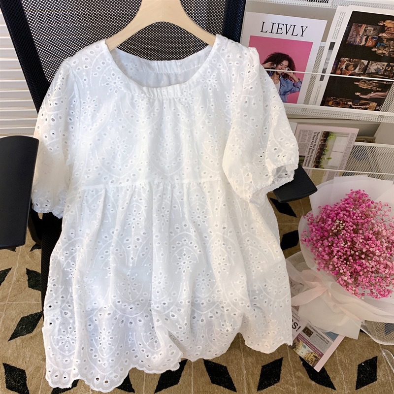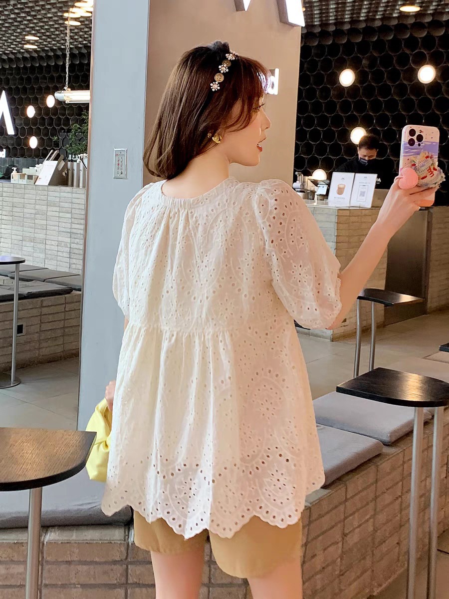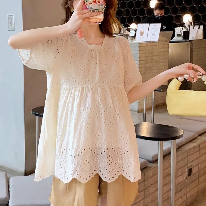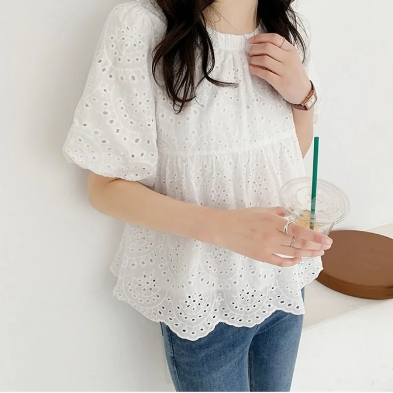 Fashion Hollow Out White Embroidery Women Blouses Short Sleeve Casual Loose Shirts Summer Elegant Puff Sleeve Tops