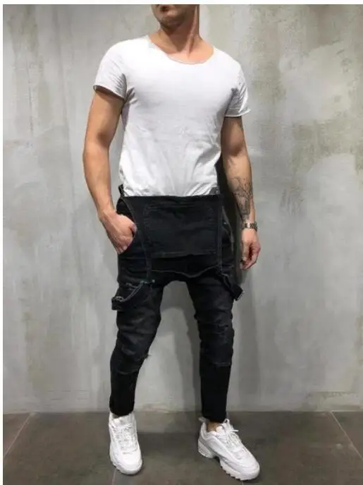 Fashion Loose Men’s Suspenders Jumpsuit Denim Overalls Street Man Straight Hole Pants Male Clothing