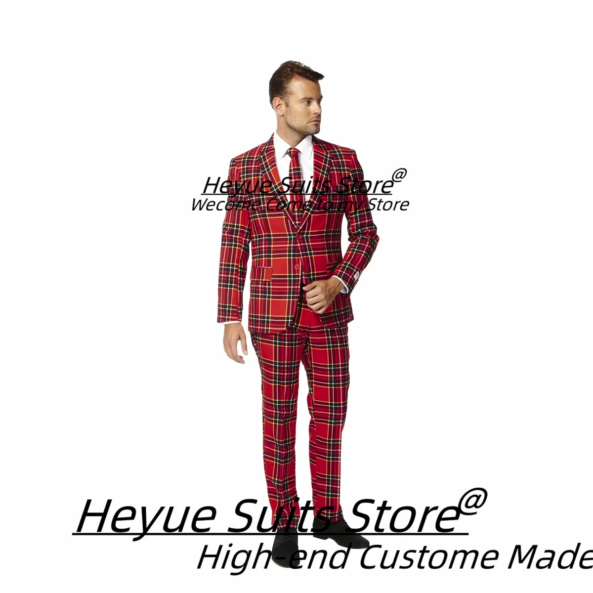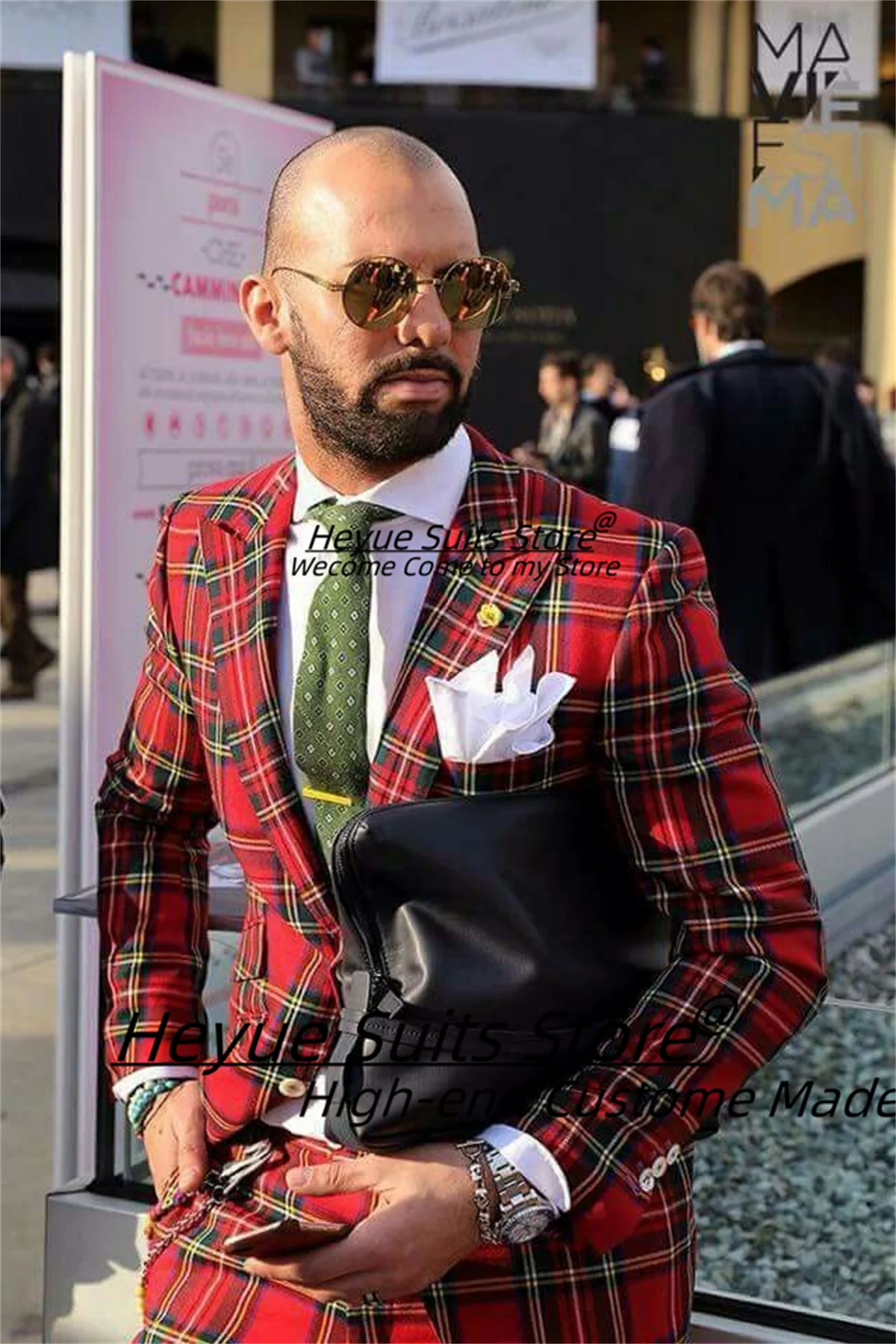 Fashion Red Plaid Men Suits Customized Groom Tuxedos Slim Fit Peak Lapel Male Blazers 2 Pieces Sets Handsome trajes para hombre