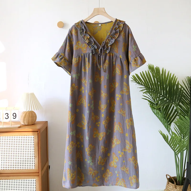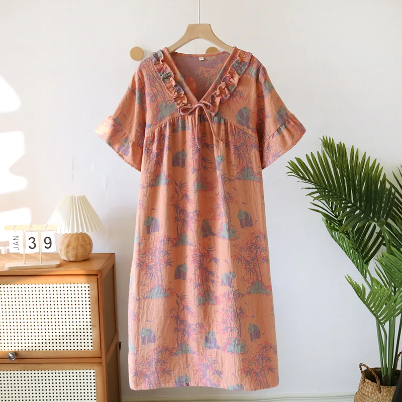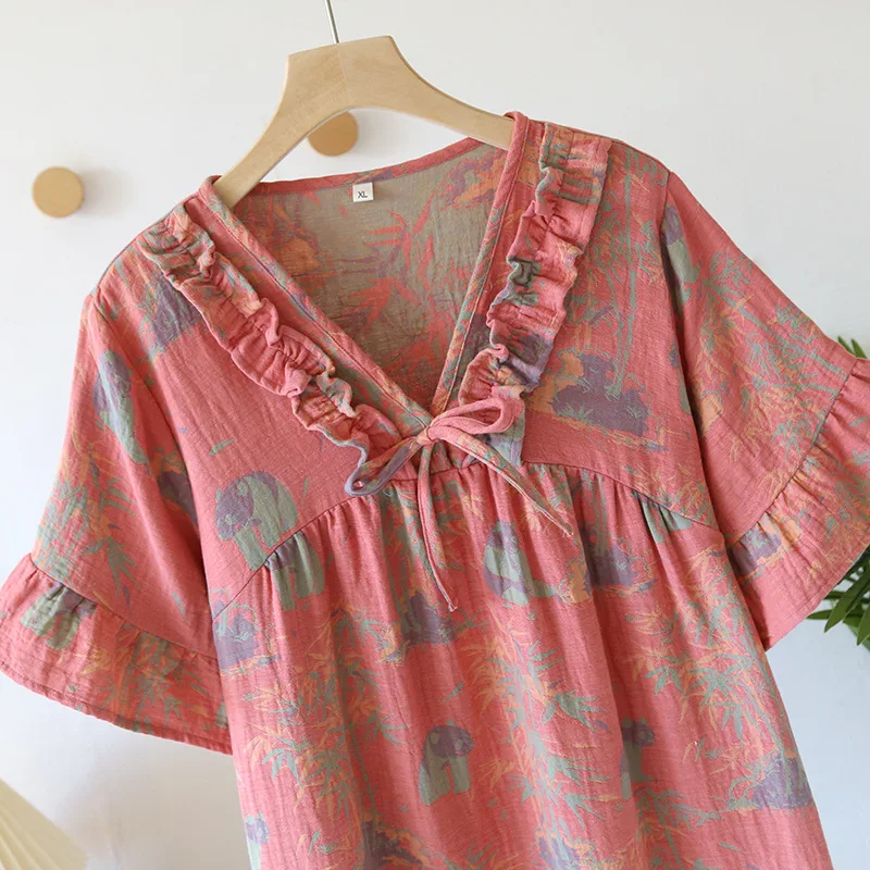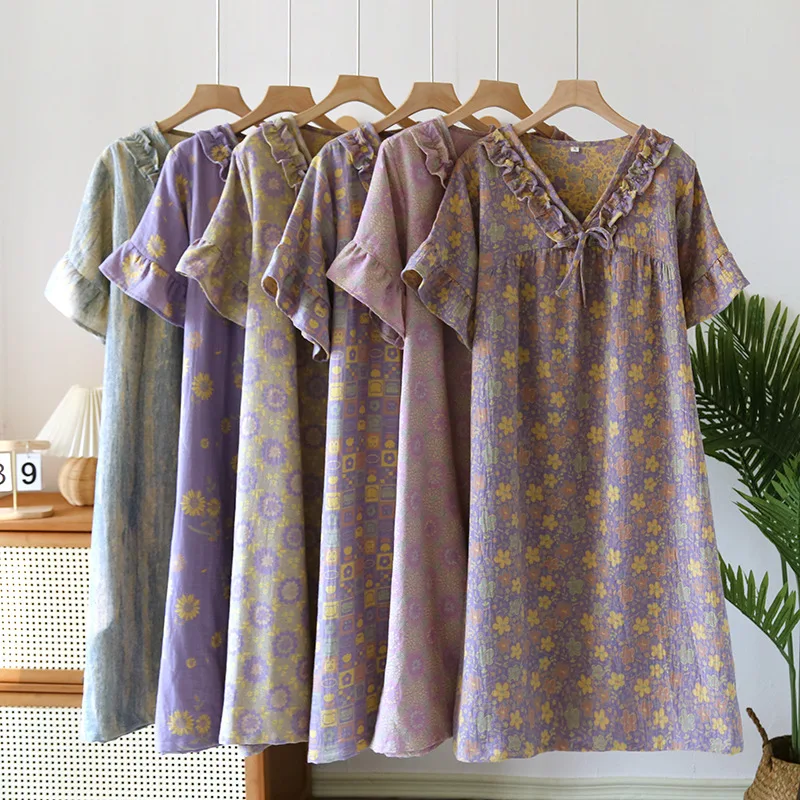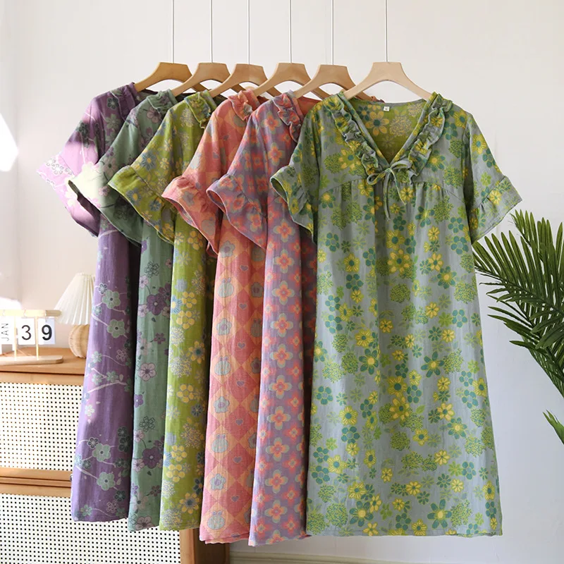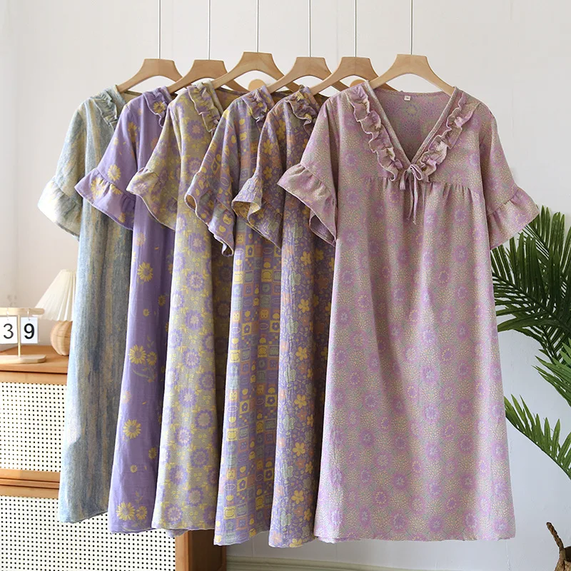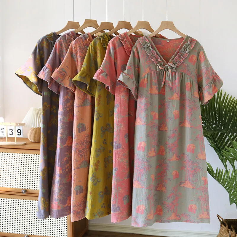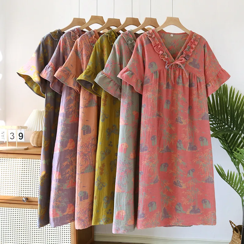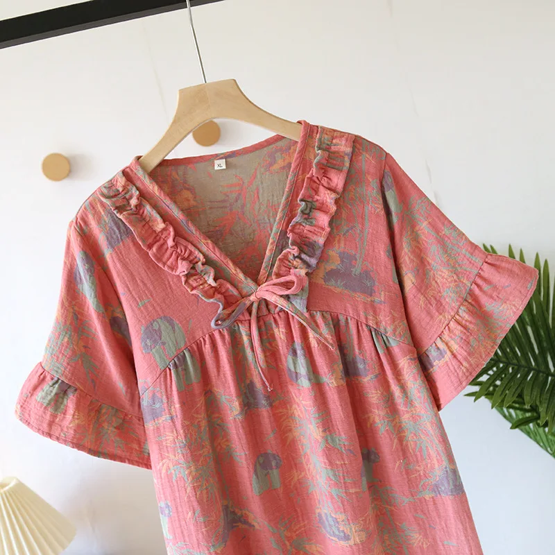 Female Fungus Design V-neck Multi Colors Nightgown for Spring and Summer Short Sleeved Loose Home Mid-long Cotton Night Gown