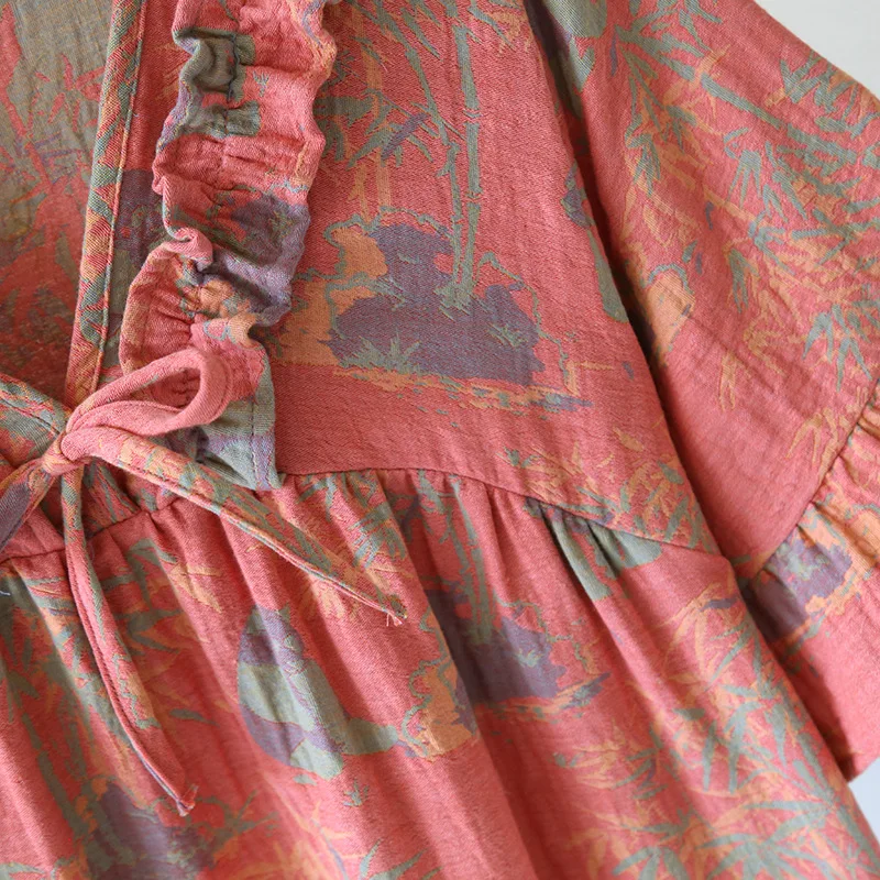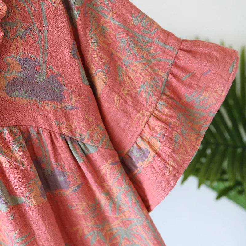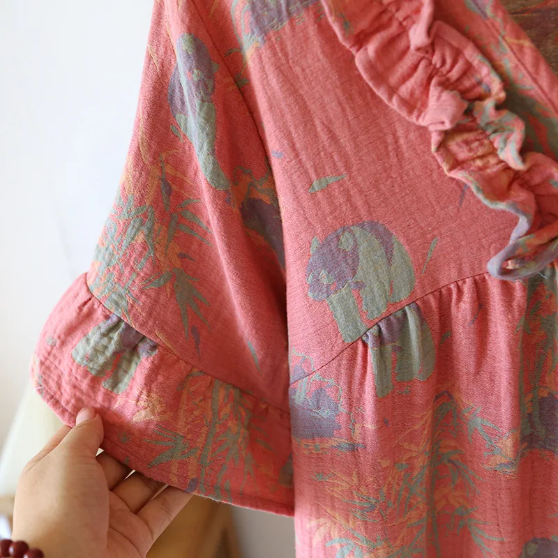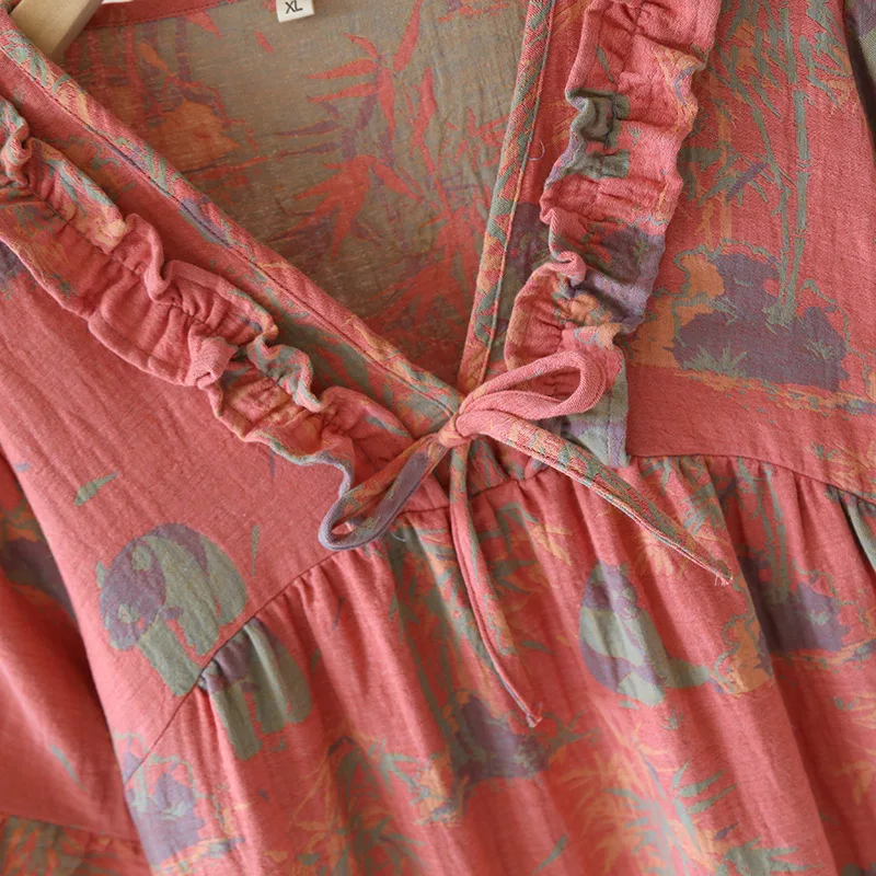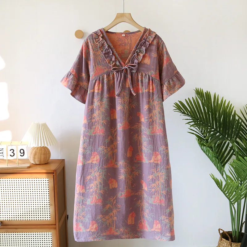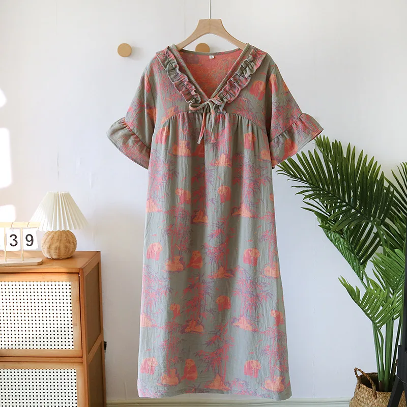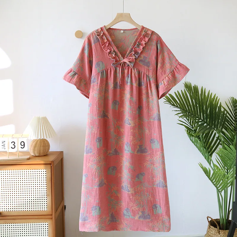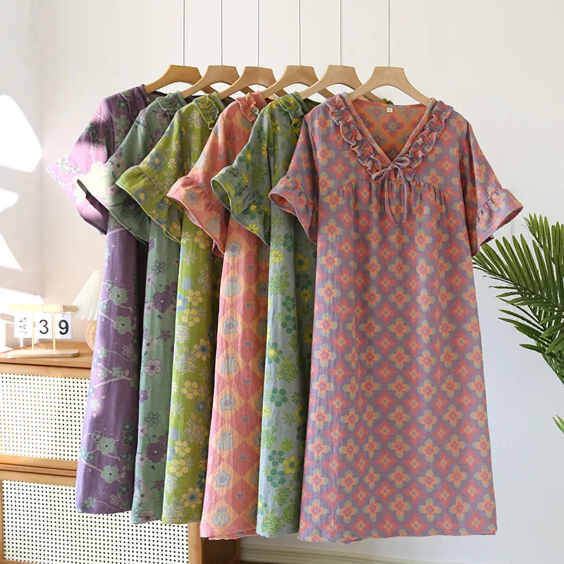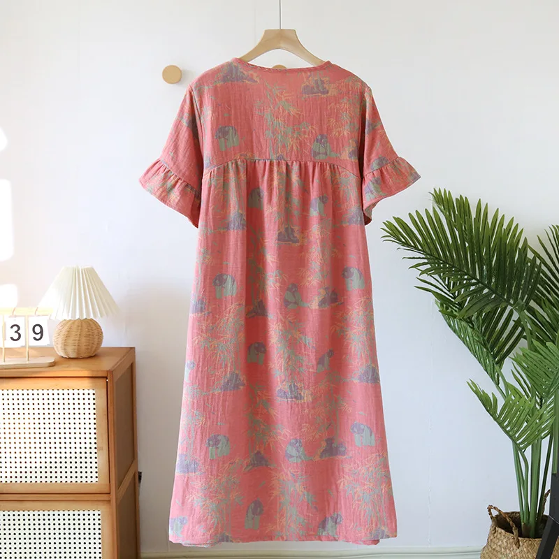 Female Fungus Design V-neck Multi Colors Nightgown for Spring and Summer Short Sleeved Loose Home Mid-long Cotton Night Gown