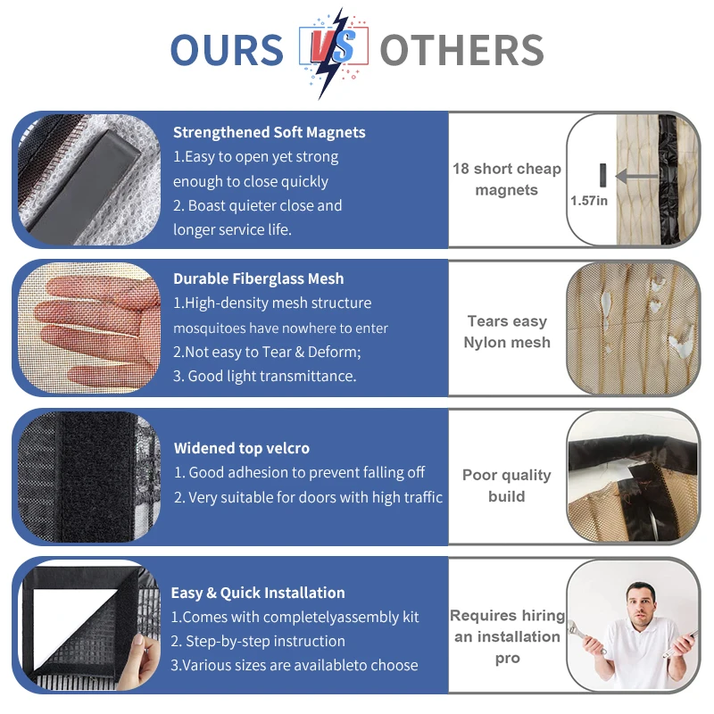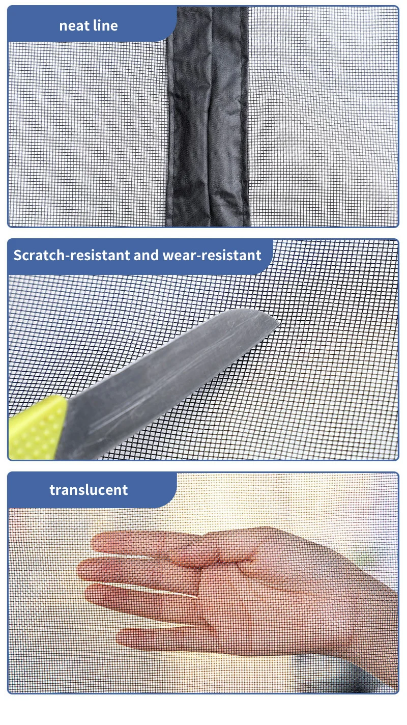 Made from 100% premium fibreglass, the material is high temperature resistant, corrosion-resistant, anti-aging, acid and alkali resistant, strong weather resistant. No matter what the weather is, the fibreglass mesh door will never distort, can withstand strong performance for years.